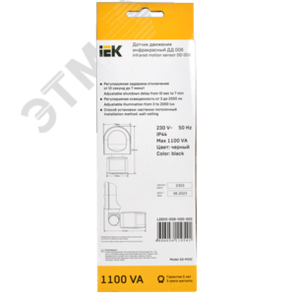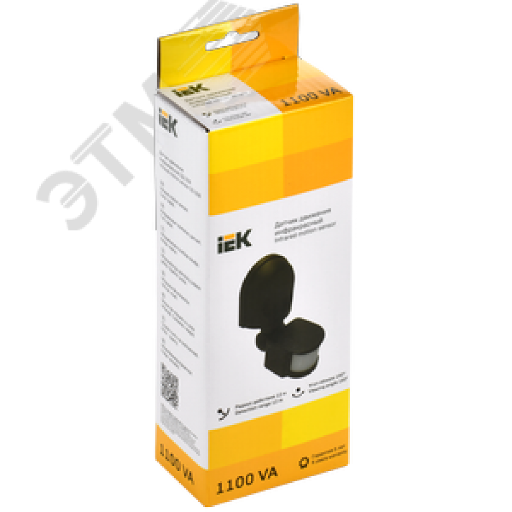 Технические характеристики Датчик движения ДД 008 черный, максимальная нагрузка 1100 Вт, угол обзора 180 градусов, дальность 12м, IP44