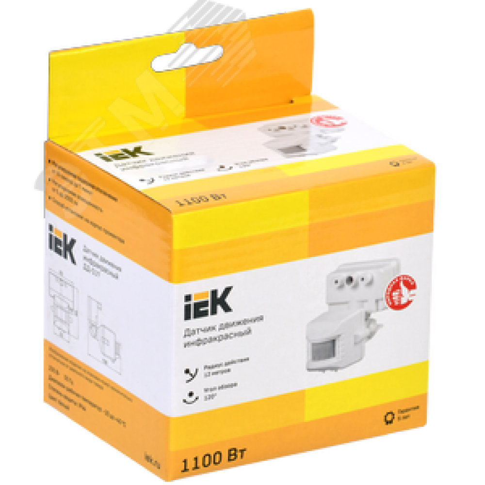 Технические характеристики Датчик движения ДД 019 белый, максимальная нагрузка 1100 Вт, угол обзора 120 градусов, дальность 12м, IP44