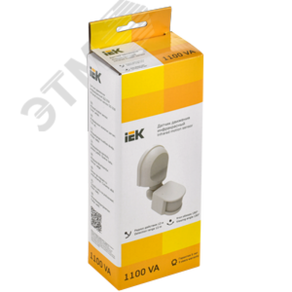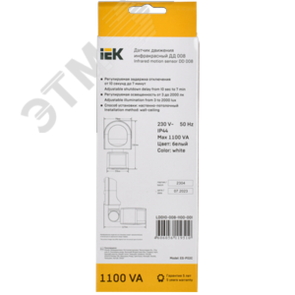 Технические характеристики Датчик движения ДД 008 белый, максимальная нагрузка 1100 Вт, угол обзора 180 градусов, дальность 12м, IP44