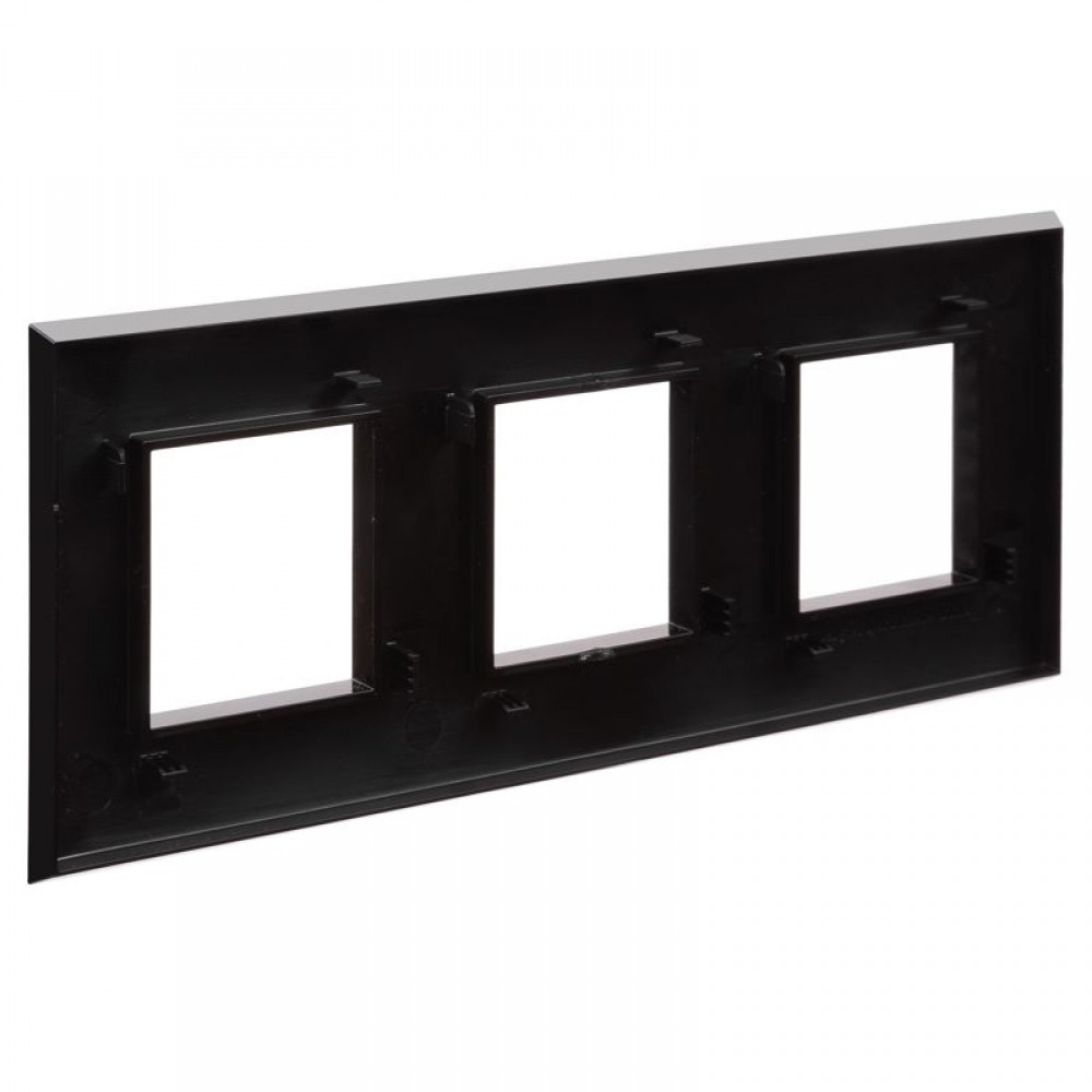 Рамка имеет 3 места под электроустановочные изделия (максимальная вместимость – 6 модулей) и может размещаться как горизонтально, так и вертикально. Габаритные размеры: 235х90 мм. Материал – термопласт.