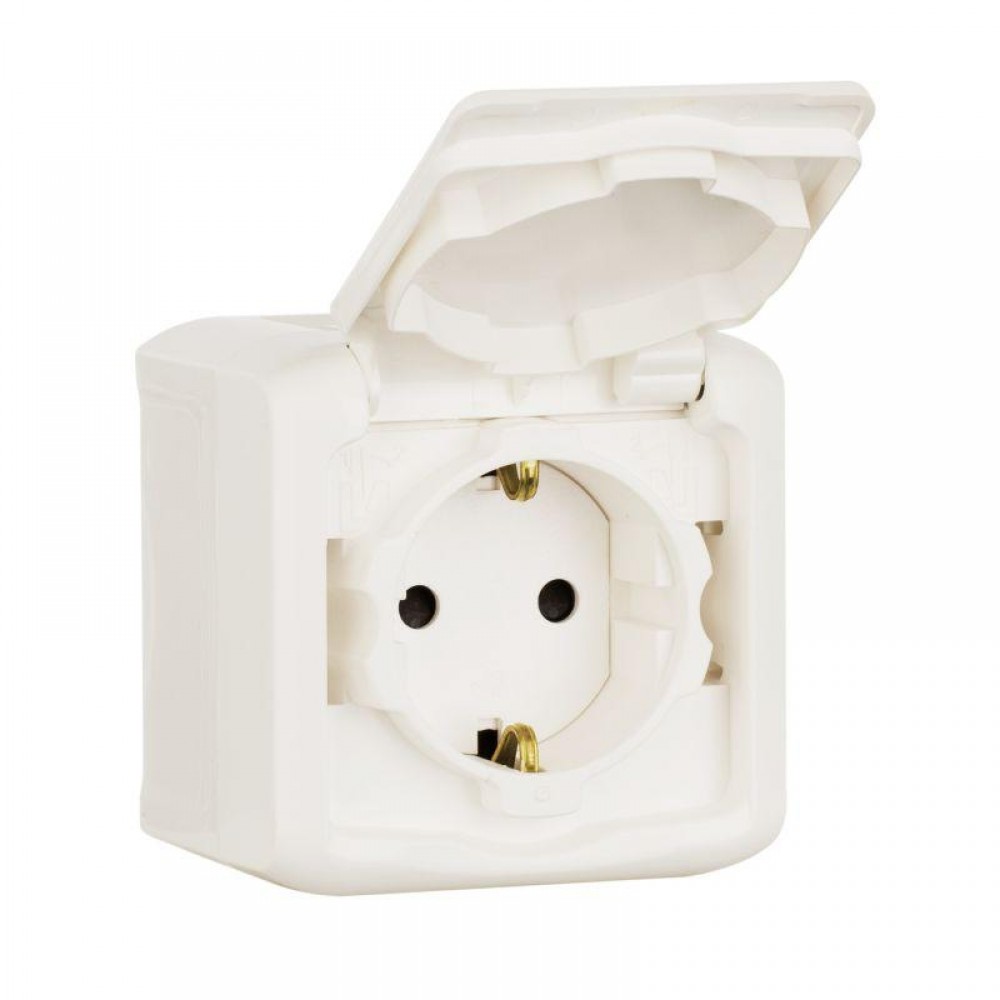 Изготовлен из пластика, квадратной формы, со стороной, равной 70 мм, белого цвета. Предусмотрены защитные шторки, автоматически закрывающие гнезда розетки при вынутой вилке, и крышка.