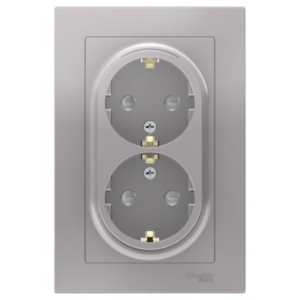 Розетка двойная Systeme Electric (ранее Schneider Electric) серии AtlasDesign (в сборе, цвет алюминий) с заземлением и шторками подходит для сетей 250 В, на ток 16 А.