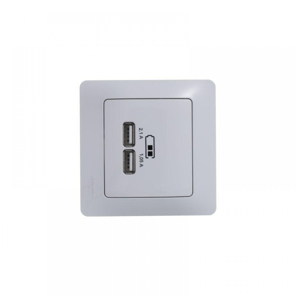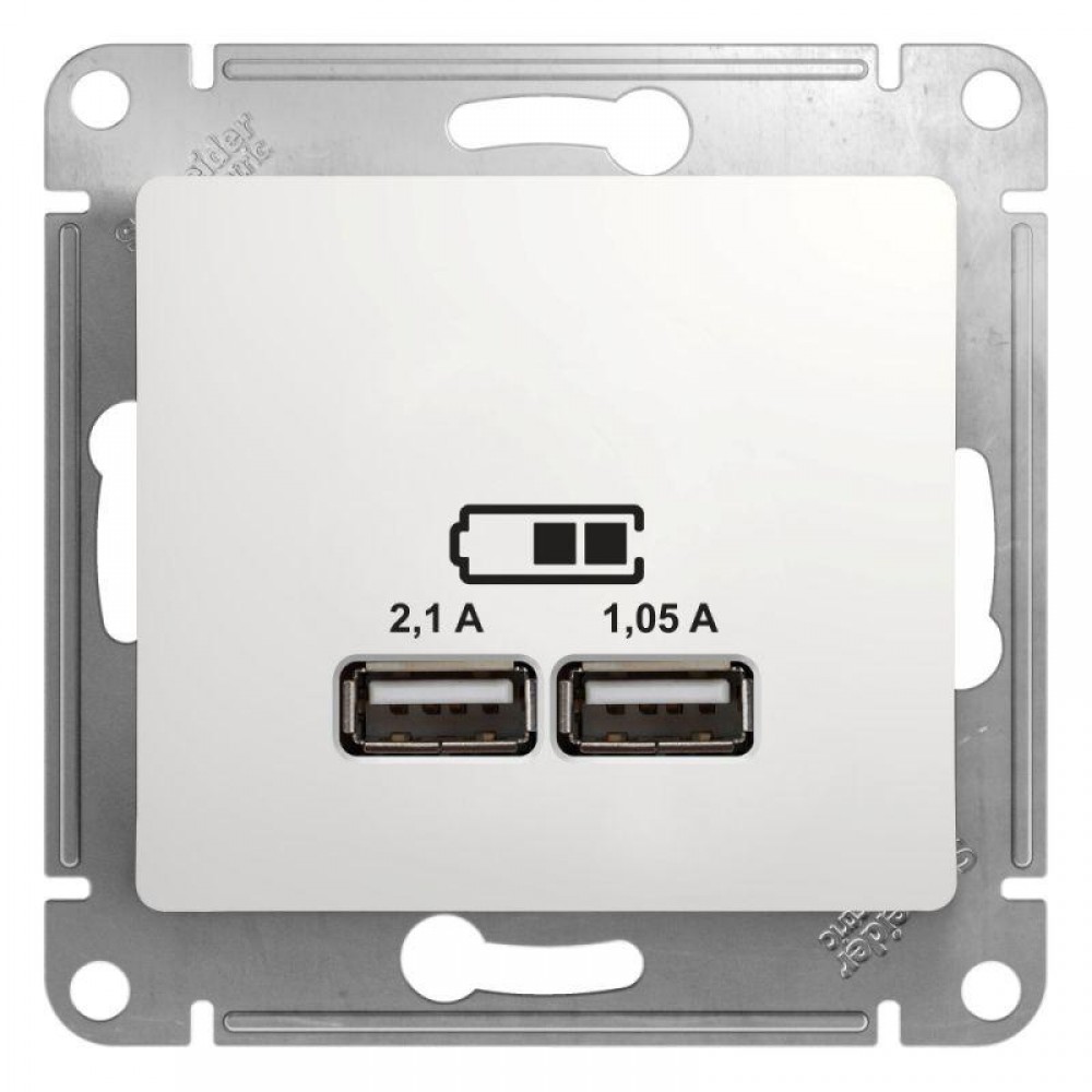 Механизм Systeme Electric (ранее Schneider Electric) серии Glossa (цвет белый) розетки с двумя разъёмами USB с выходными напряжением 5 В постоянного тока и выходами с номинальным током по 2,1 А.