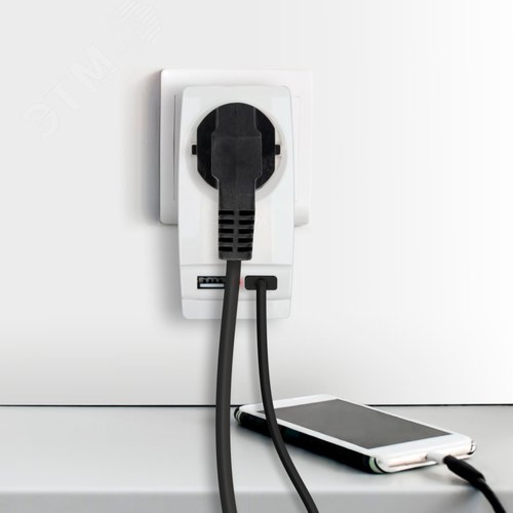 Технические характеристики Адаптер ''Polynom'' 1гн 220V + 2xUSB 2100mA, c заземл, (белый) (10/60/1440) SP-1e-USB-W''