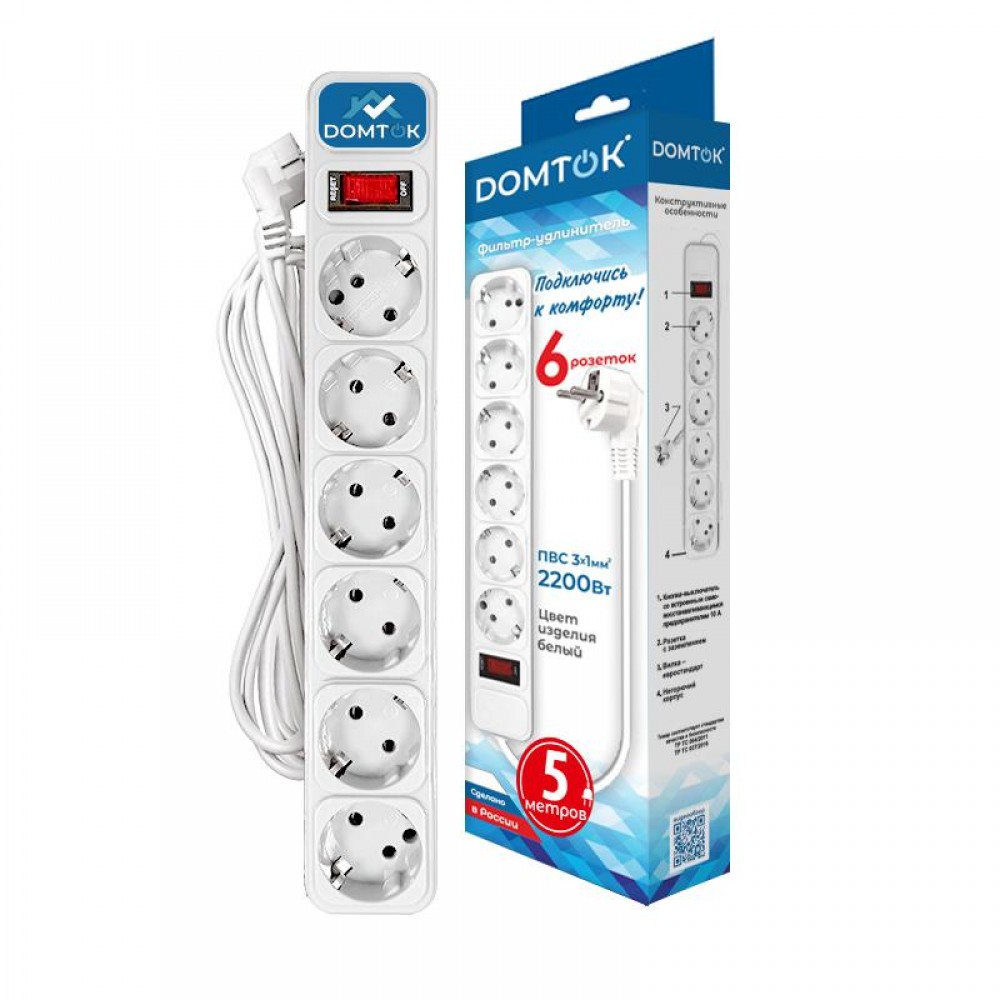 Удлинитель с сетевым фильтром 6х5м с заземл 10А IP20 2.2кВт ПВС 3х1 с выкл. бел. DOMTOK 2517