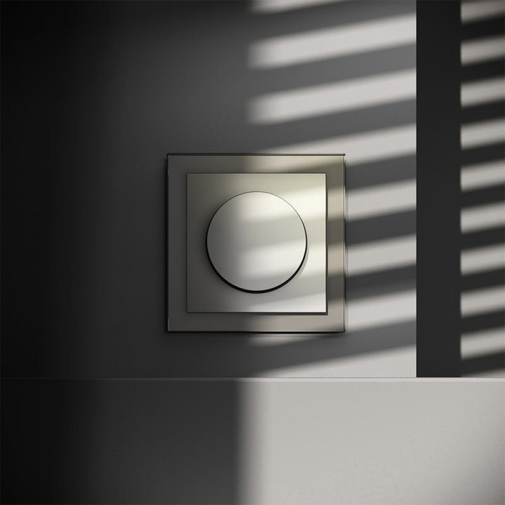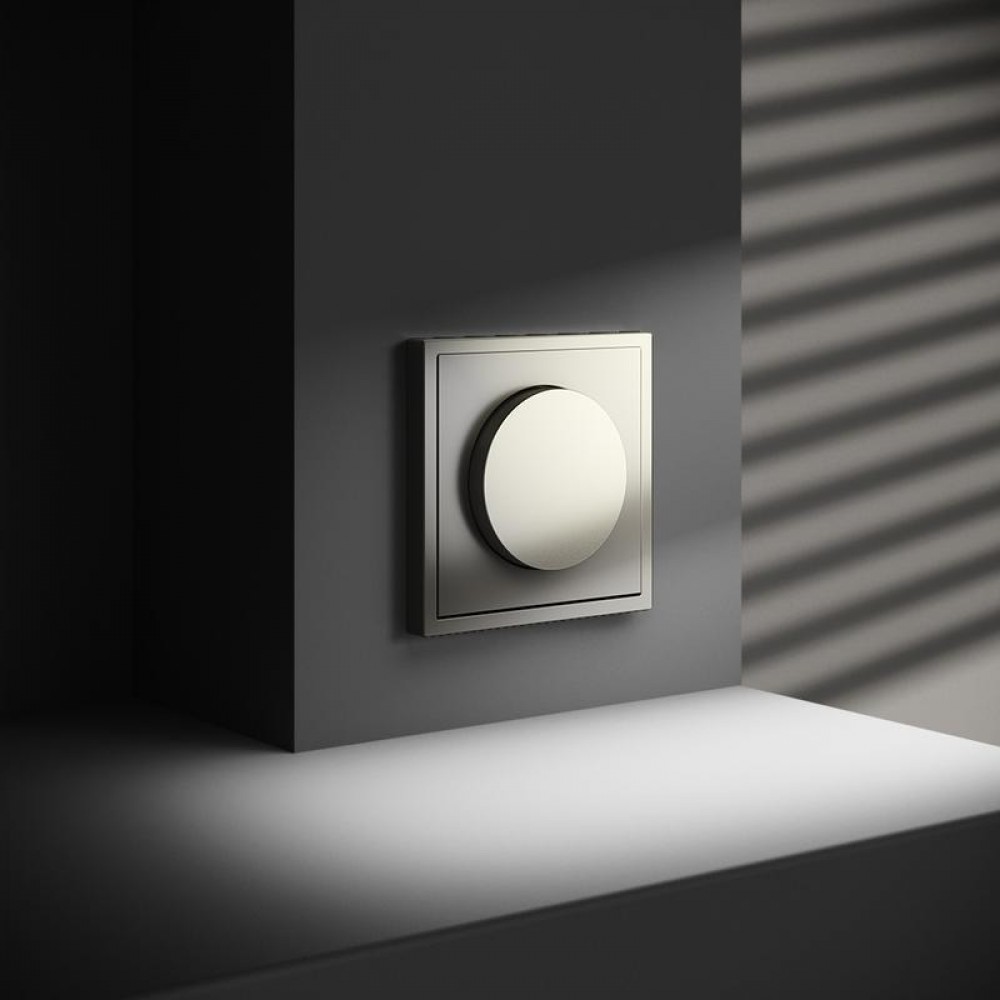 Место установки. Светорегулятор необходим для управления яркостью освещения в помещении. Устройство совместимо с любым источником света, поддерживающим фазное диммирование. Корпус. Светорегулятор выполнен в виде вращающейся кнопки, позволяющей регулировать яркость в широком диапазоне. При нажатии на нее устройство работает как выключатель (включает/выключает освещение). Корпус — устойчивый к повреждениям и нагреву поликарбонат. Конструктивные особенности. Максимальная резистивная нагрузка светорегулятора — 300 Вт, минимальная — 5 Вт. Можно подключить устройство как обычный выключатель или по проходной схеме. Диммирование базируется на методе отсечения по заднему фронту, что гарантирует совместимость со светодиодными лампами и исключает появление резких колебаний напряжения. Ток увеличивается плавно, что особенно важно для сохранения производительности и долговечности светодиодных источников. Предусмотрена регулировка ограничения минимального уровня яркости (под накладкой механизма).