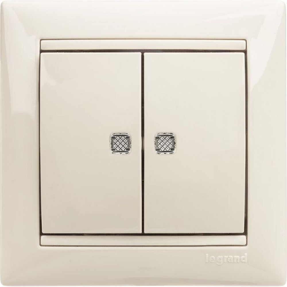Представляет собой механизм выключателя с двумя клавишами. Цвета слоновой кости. Предусмотрена световая индикация режима вкл./выкл. Изготовлен из пластика. Монтируется под штукатурку.
