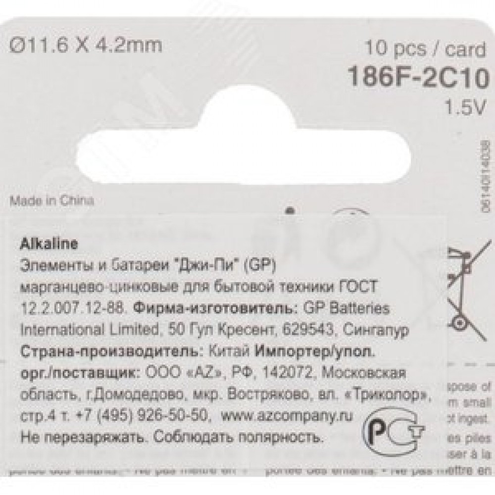 Технические характеристики Батарейка пуговичная алкалиновая GP 186A