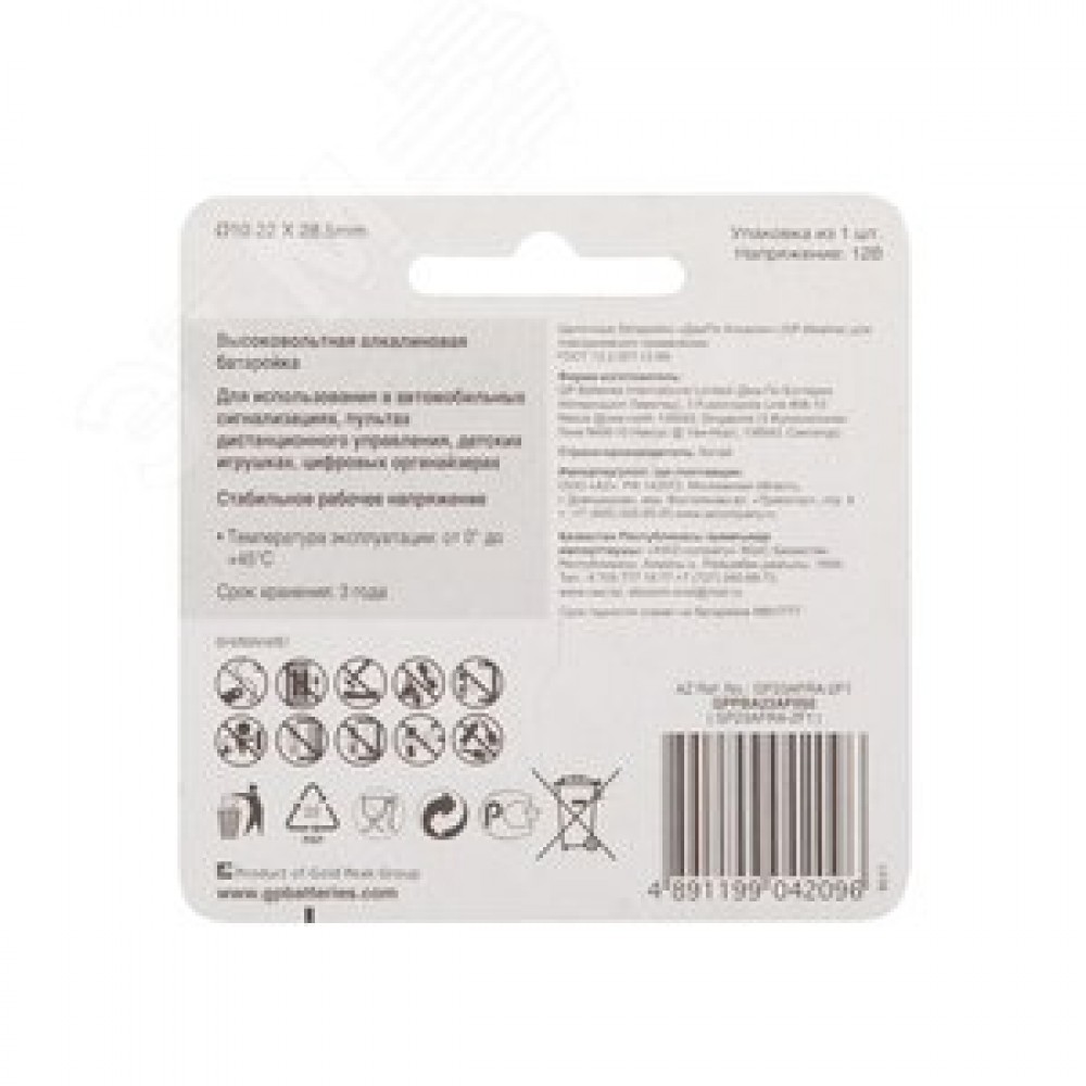 Технические характеристики Батарейка высоковольтная 12В GP 23AF - 1 шт. в блистере