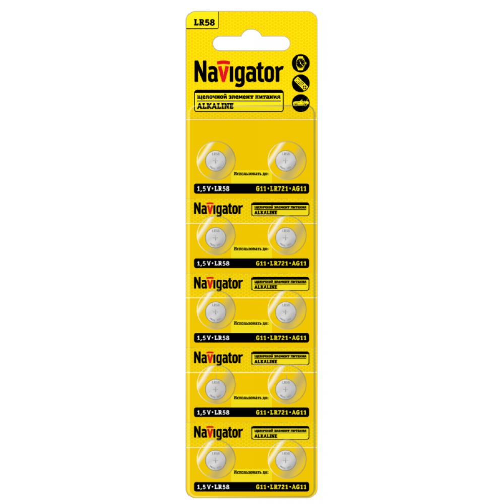 Технические характеристики Элемент питания алкалиновый "таблетка" 95 667 NBT-10 (LR58 AG11 LR721 BP10) (блист.10шт) Navigator 95667