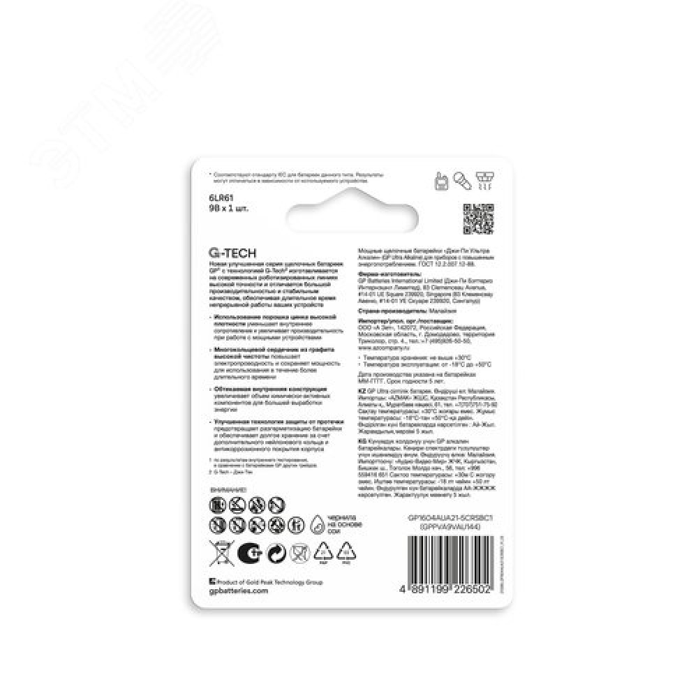 Технические характеристики Батарейка алкалиновая GP Ultra Alkaline G-Tech 9V Крона - 1 шт. на блистере