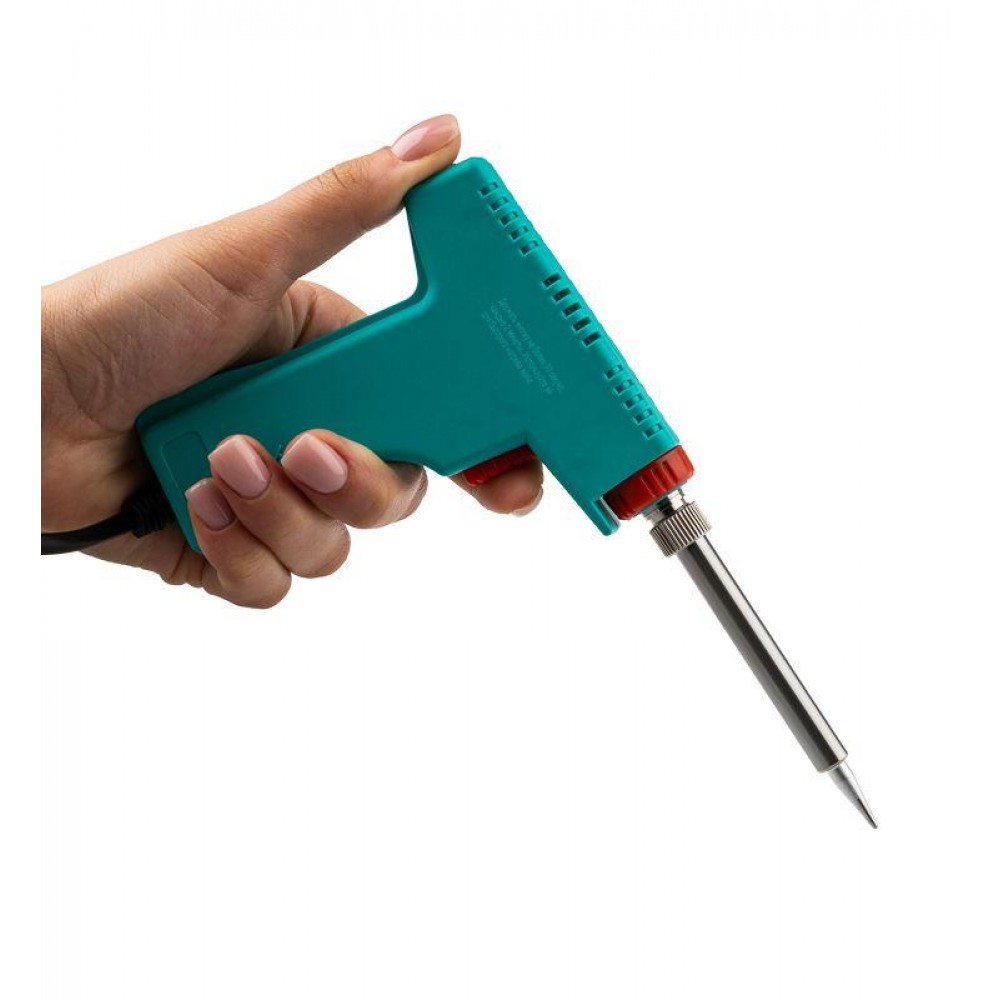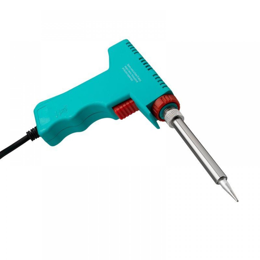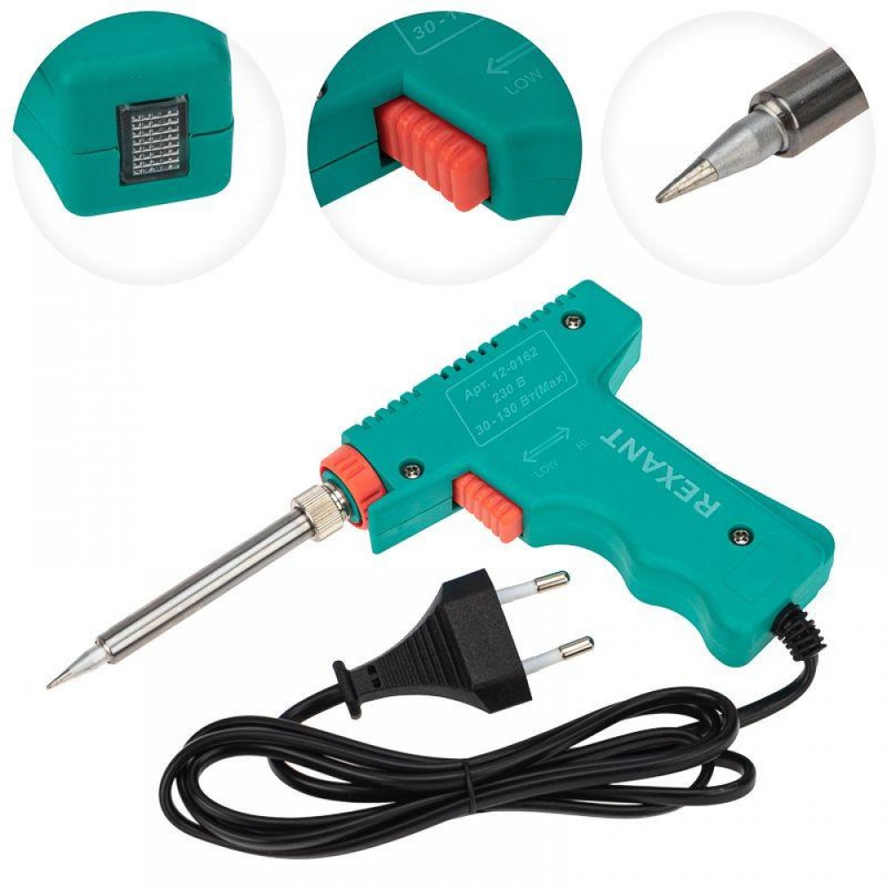 Конструктивные особенности: рукоятка в форме пистолета, возможность осуществлять пайку в двух режимах мощности (30Вт и 130Вт). Максимальная мощность и ускоренный разогрев активируются нажатием и удержанием кнопки, расположенной на рукоятке, что позволяет мастеру сначала установить жало инструмента в определенную точку пайки, а затем перевести паяльник в максимальный рабочий режим.