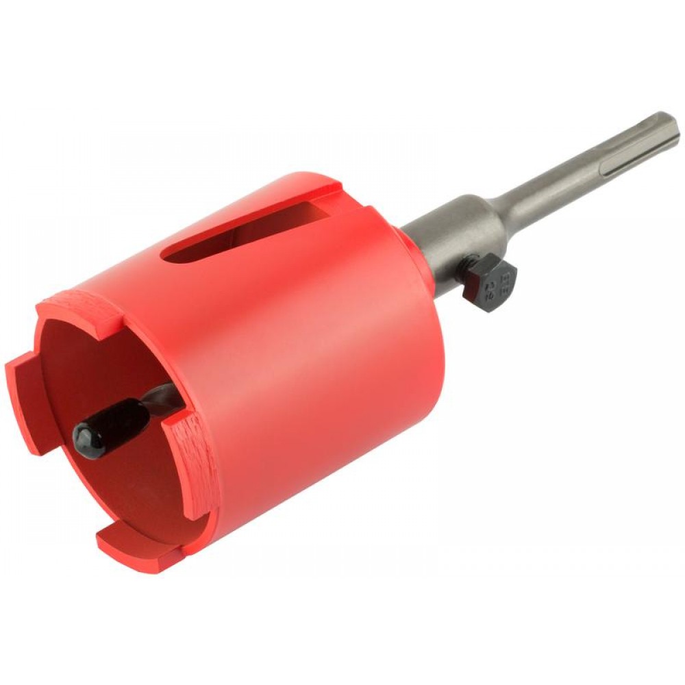 Коронка кольцевая алмазная КУРС с центрирующим сверлом и хвостовиком SDS-plus предназначена для безударного сверления отверстий под монтажные коробки в бетоне (в том числе армированном) и кирпиче. При работе требуется водяное охлаждение. Центрирующее сверло из легированной стали с наконечником из композитного карбид-вольфрамового сплава ВК6 позволяет точно позиционировать коронку и предотвращает ее смещение во время работы. Резцы коронки покрыты порошком из технических алмазов.