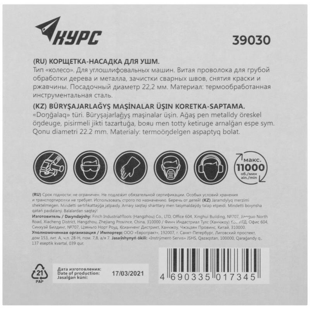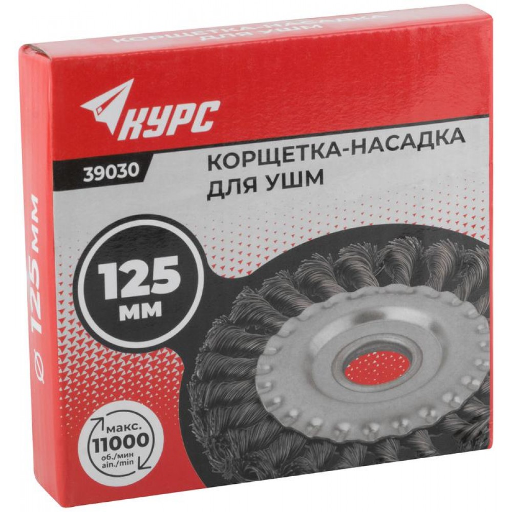 Технические характеристики Корщетка дисковая прямая d посадочный 22.2мм стальная витая проволока 125мм КУРС 39030