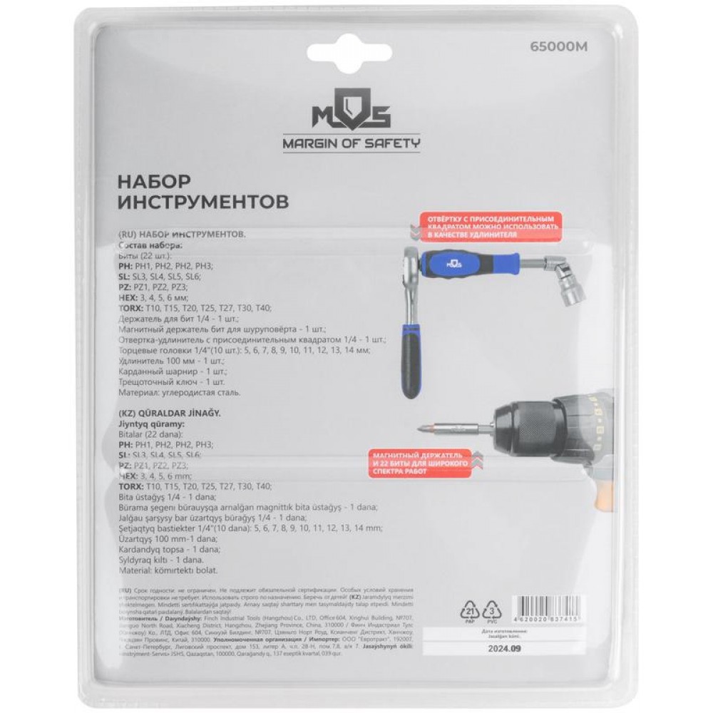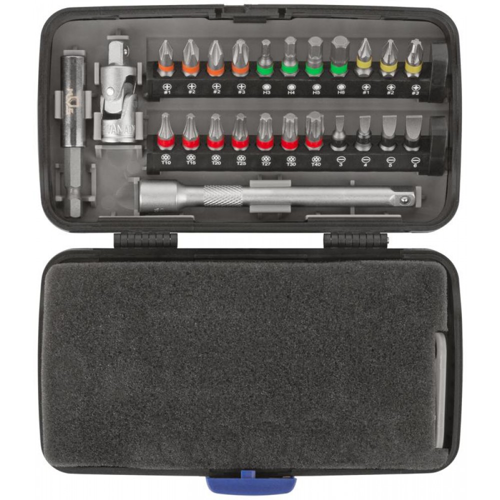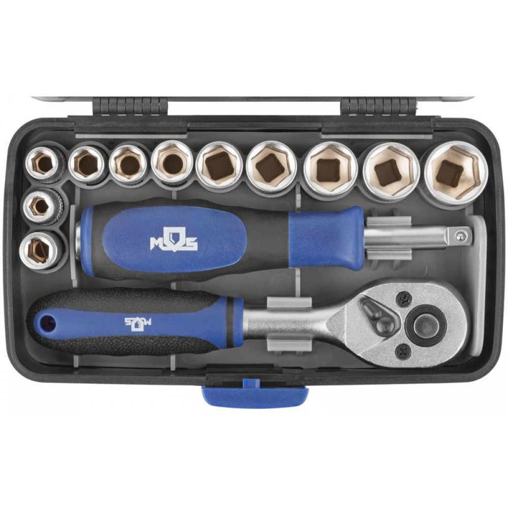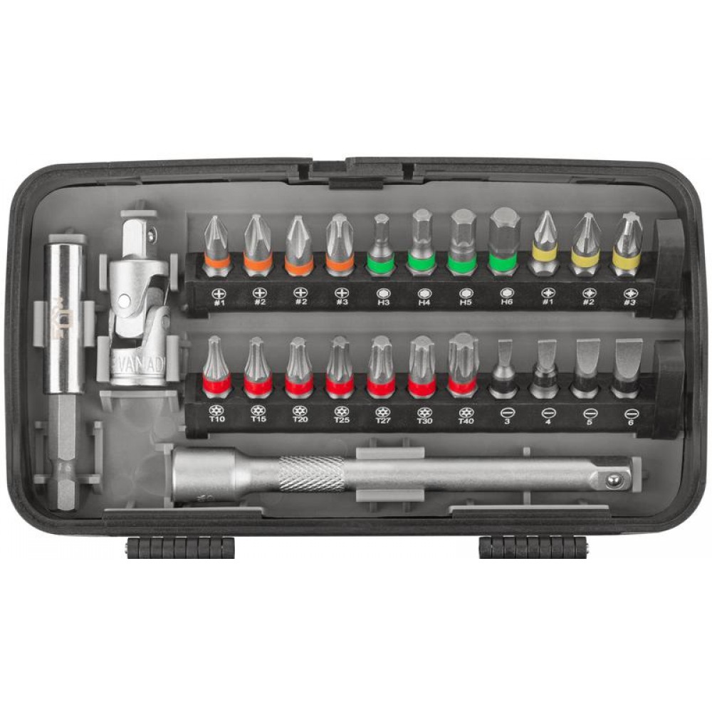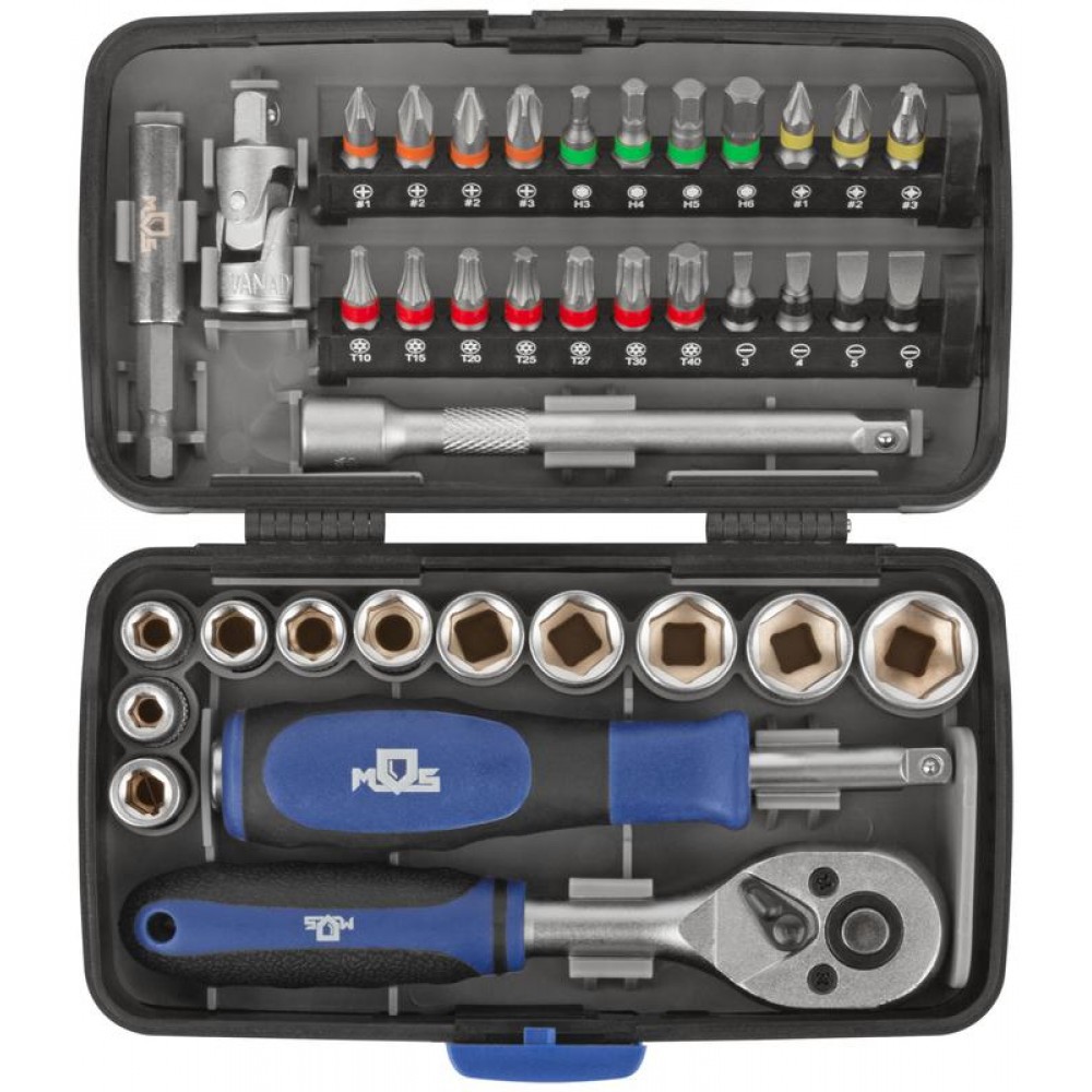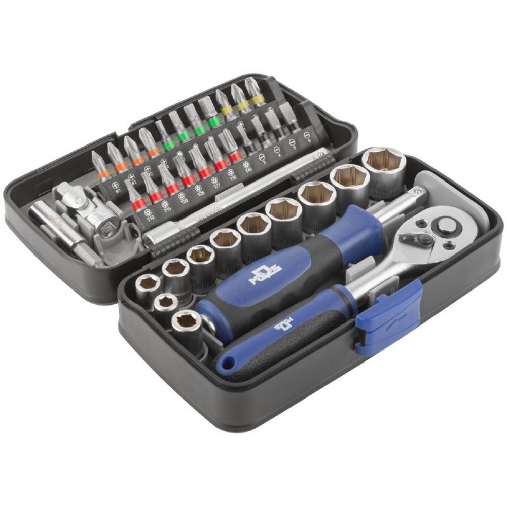 Набор инструментов MOS, включающий в себя 38 предметов, предназначен для различных ремонтно-монтажных работ. Все компоненты изготовлены из закаленной углеродистой стали. Прорезиненные ручки обеспечивают удобный рабочий процесс. 10 торцевых головок и 22 биты делают набор универсальным. Магнитный адаптер позволяет фиксировать биты в шуруповерте. Отвертка на конце имеет присоединительный квадрат и может использоваться в качестве удлинителя. Благодаря компактному кейсу набор не занимает много места, его удобно хранить и брать с собой. Состав набора: биты (22 шт.); держатель для бит 1/4 (1 шт.); магнитный держатель бит для шуруповёрта (1 шт.); отвертка-удлинитель с присоединительным квадратом 1/4 (1 шт.); торцевые головки 1/4" (10 шт.); удлинитель 100 мм (1 шт.); карданный шарнир (1 шт.); трещоточный ключ (1 шт.).