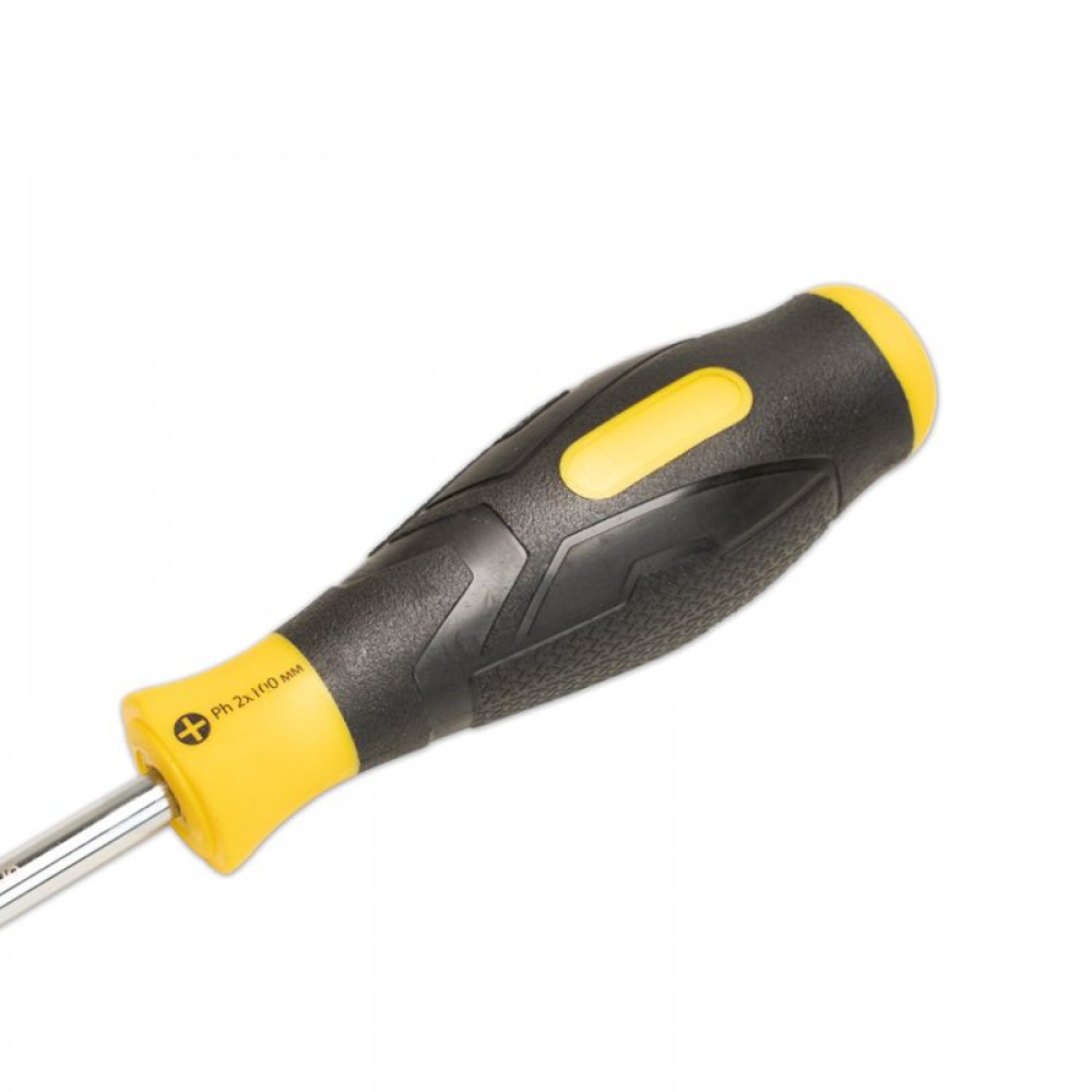 Крестовая отвертка SHTOK Ph2x100 мм 09108 используется для работы с саморезами, имеющими профиль Phillips. Данная отвертка оснащена рабочей частью из термообработанной стали. Двухкомпонентная рукоятка со специальными вставками предотвращает соскальзывание руки во время работы, а также препятствует образованию мозолей.