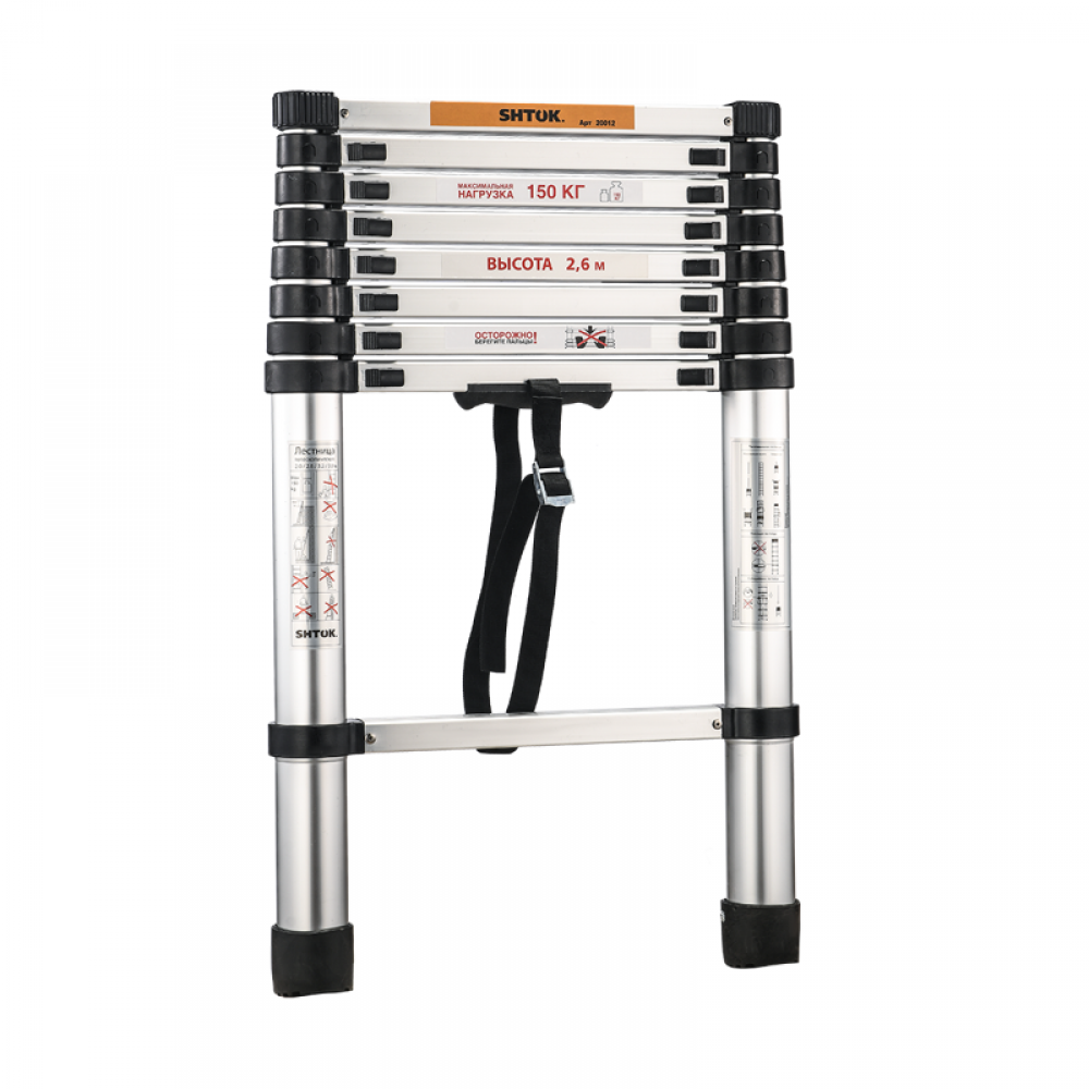 Телескопическая лестница SHTOK 2.6м 20012 пригодится для прокладывания электрических кабелей, монтажа и демонтажа вывесок, сбора урожая, покрасочных работ и многих других задач на высоте.