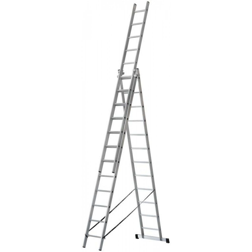 Усиленная трехсекционная алюминиевая лестница FIT РОС рассчитана на нагрузку в 150 кг, подходит для бытового и промышленного применения. Рабочая площадка наверху отсутствует. Модель обеспечена следующими элементами безопасности: ножки закрыты противоскользящими накладками, ременная траверса фиксирует расхождение, надёжный стопорный рычаг держит соединяемые элементы. Двухстороннее расположение ступеней позволяет выполнять подъём в любом направлении. Секции можно использовать отдельно, а также собирать их в различных вариантах, что обеспечивает широкий диапазон применения лестницы.