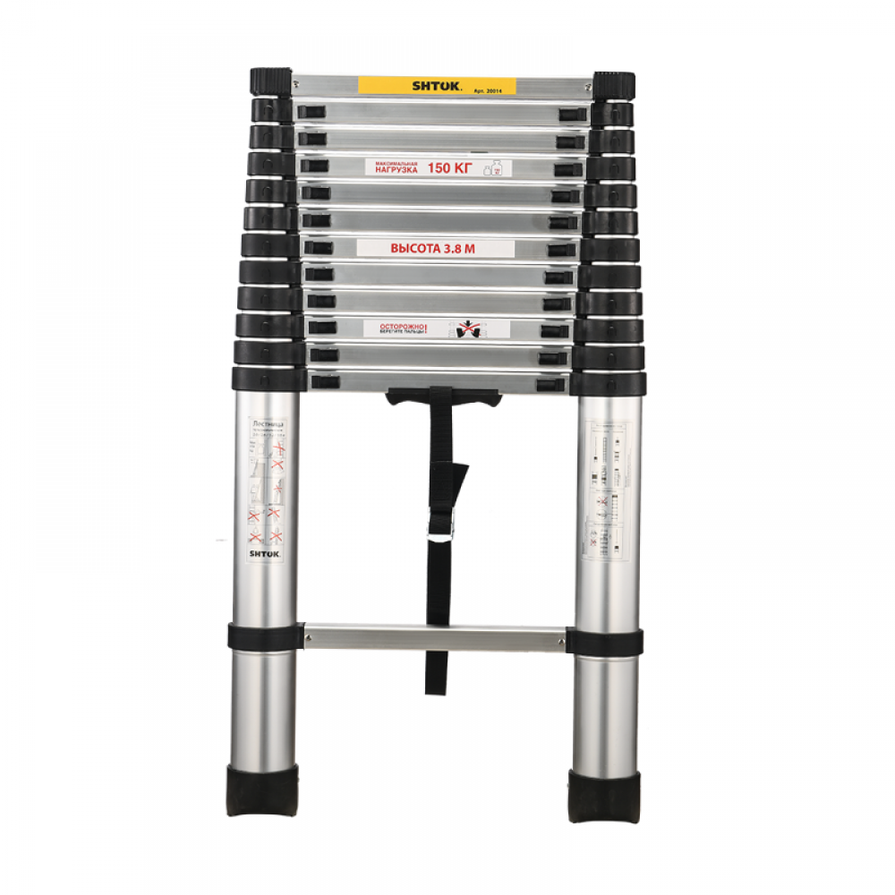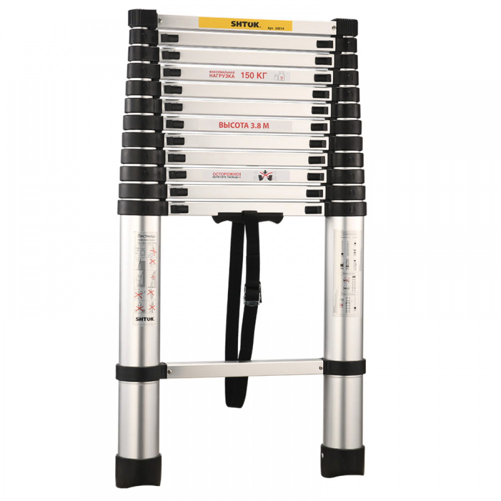 Телескопическая стремянка SHTOK 2.6м 20018 выдерживает нагрузку до 150 кг. За счет прочной конструкции из дюралюминия и первичного (переработанного) пластика обеспечивает надежность и долговечность использования. На стенде испытываемая стремянка выдерживает 10 000 циклов на раскрытие-закрытие.