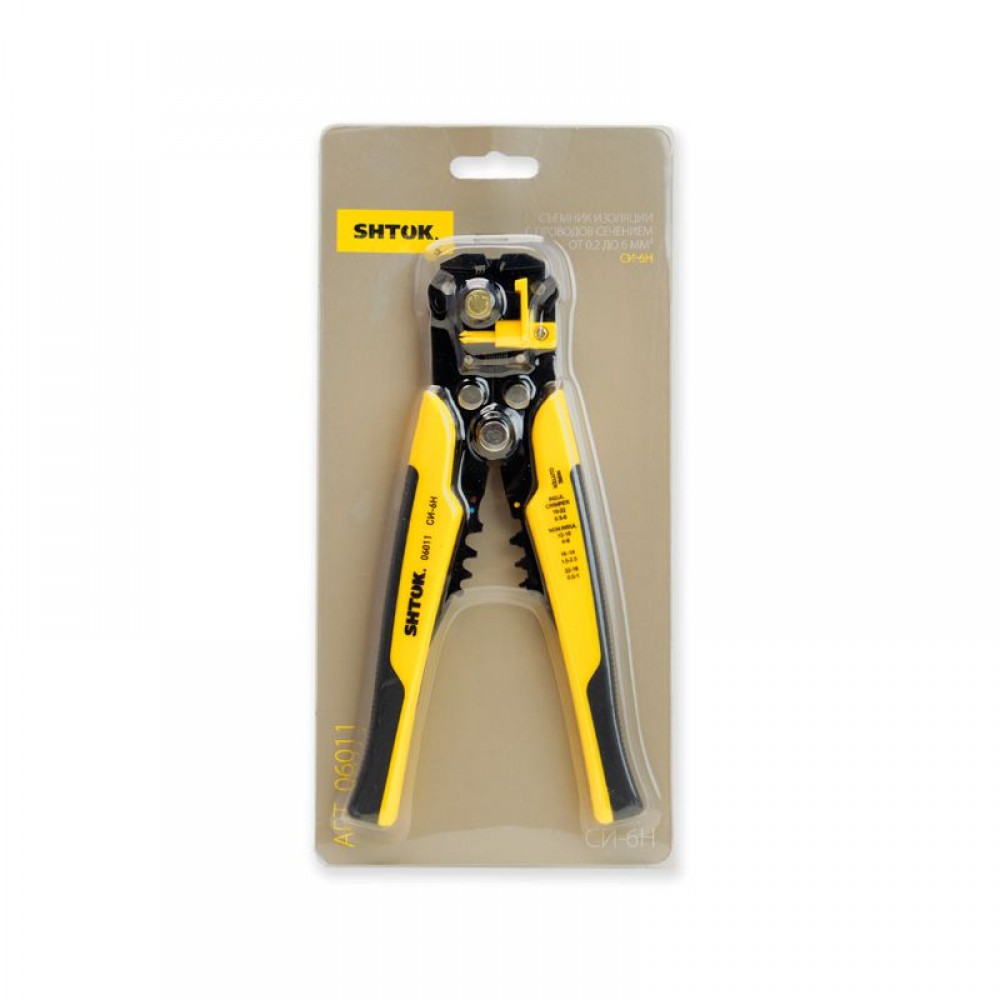 Устройство для снятия изоляции SHTOK СИ-6H 06011 - это электромонтажный инструмент ""два в одном"". Он служит для опрессовки и снятия изоляции с проводов различного сечения. Изделие отличается простотой и удобством в работе благодаря наличию удобных рукояток с рифлением.