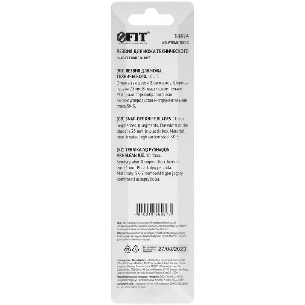 Технические характеристики Набор лезвий для ножа технического 25мм 8 сегментов сталь SK5 (уп.10шт) FIT 10424