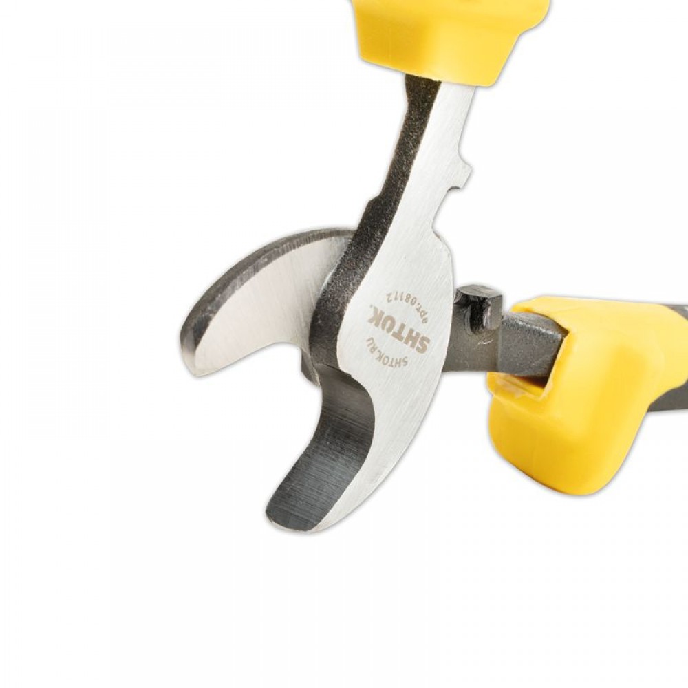 Кабелерез SHTOK 08112 используется в сборочном производстве. Рукоятки из двухкомпонентного пластика с упорами обеспечивают надежность захвата и удержания инструмента во время работы. Возможна резка одножильного и многожильного алюминиевого или медного кабеля.