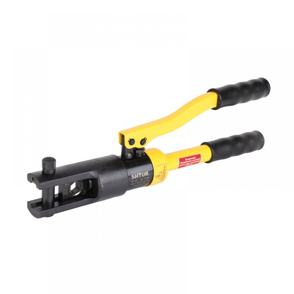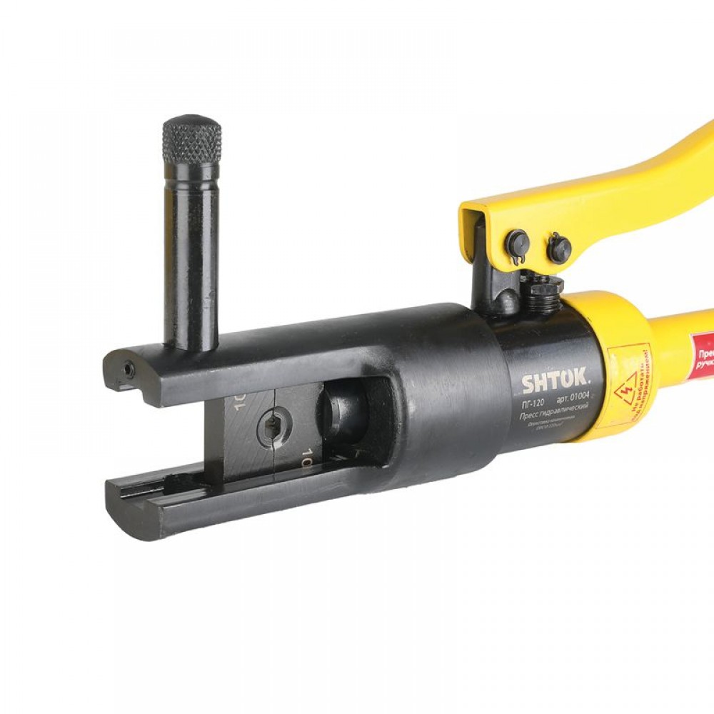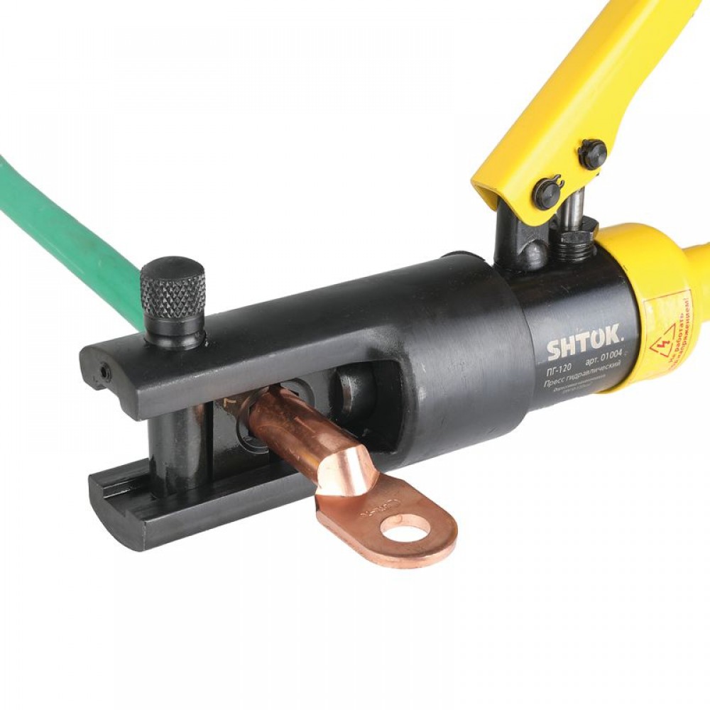 Особая конструкция ручного гидравлического пресса SHTOK ПГ-120 01004 плотно зажимает кабель, не давая ему ""выйти"" из рабочей области. Минимальная площадь опрессовки 10 мм.