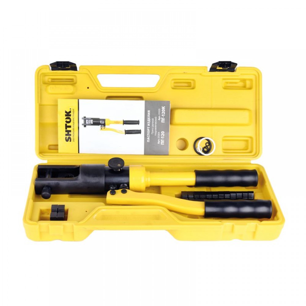 Ручной гидравлический пресс SHTOK ПГ-120 01004 предназначен для опрессовки медных и алюминиевых наконечников сечением от 10 до 120 мм2.