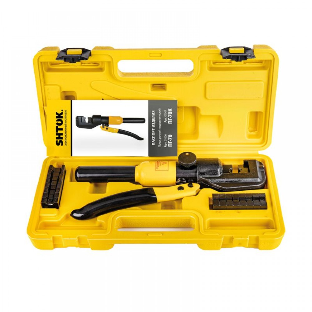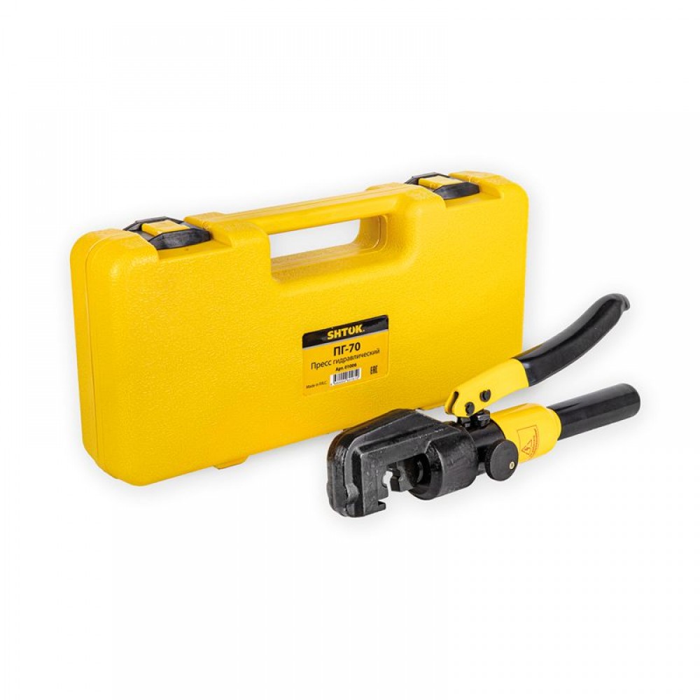 Ручной гидравлический пресс SHTOK ПГ-70 01006 предназначен для опрессовки медных и алюминиевых наконечников сечением от 4 до 70 мм2.