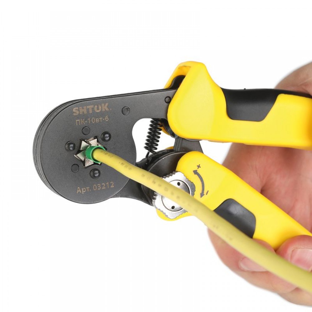 Пресс-клещи для опрессовки втулочных наконечников 0.25-10 мм2 SHTOK ПК-10вт-6 03212 оснащаются храповым механизмом, который автоматически разблокируется по завершении цикла. Двухкомпонентные рукоятки эргономичной формы способствуют удобству эксплуатации. Модель изготавливается из холоднокатанной углеродистой стали, что гарантирует высокую прочность и долговечность. Благодаря наличию специальной кнопки регулировка усилия обжима осуществляется максимально легко без использования вспомогательного инструмента.