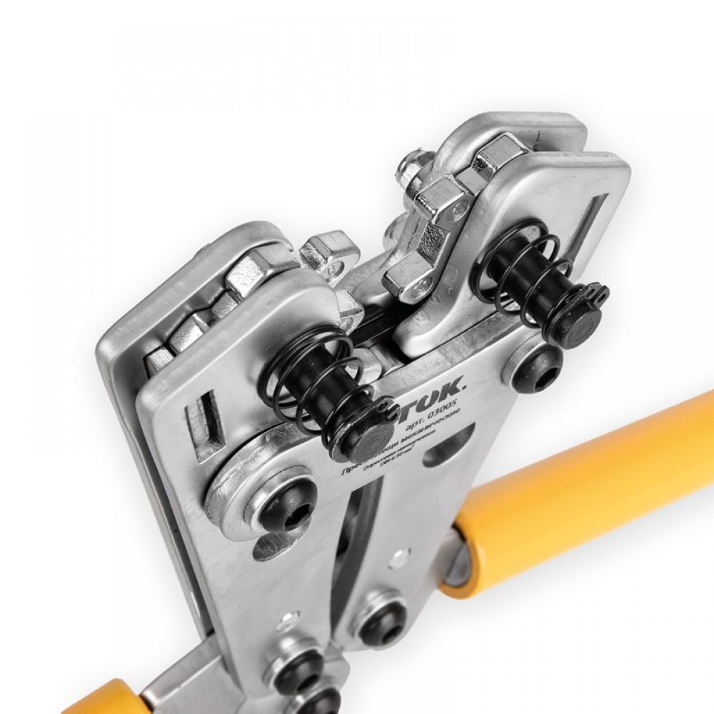 Пресс-клещи с механическим приводом для оконцевания жил с помощью алюминиевых и медных кабельных наконечников. Оконцевание осуществляется переставными матрицами револьверного типа в диапазоне сечений от 6 до 50 мм2.