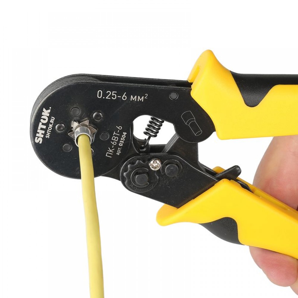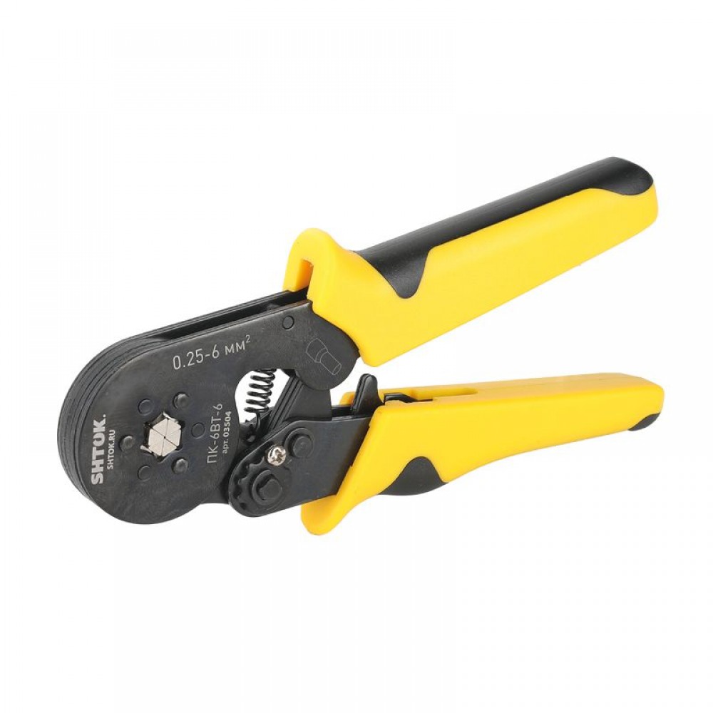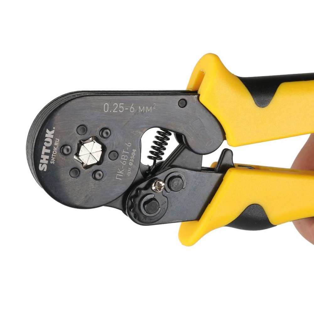 Пресс-клещи для опрессовки втулочных наконечников 0.25-6 мм2 SHTOK ПК-6вт-6 03504 оснащаются храповым механизмом, который гарантирует высокое качество результата. Двухкомпонентные рукоятки имеют эргономичную форму, что способствует удобству эксплуатации. Компактные размеры и небольшой вес обеспечивают легкость хранения и транспортировки.