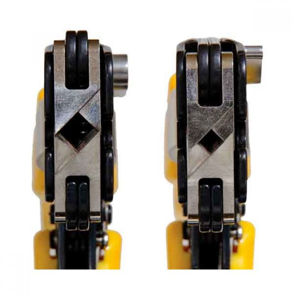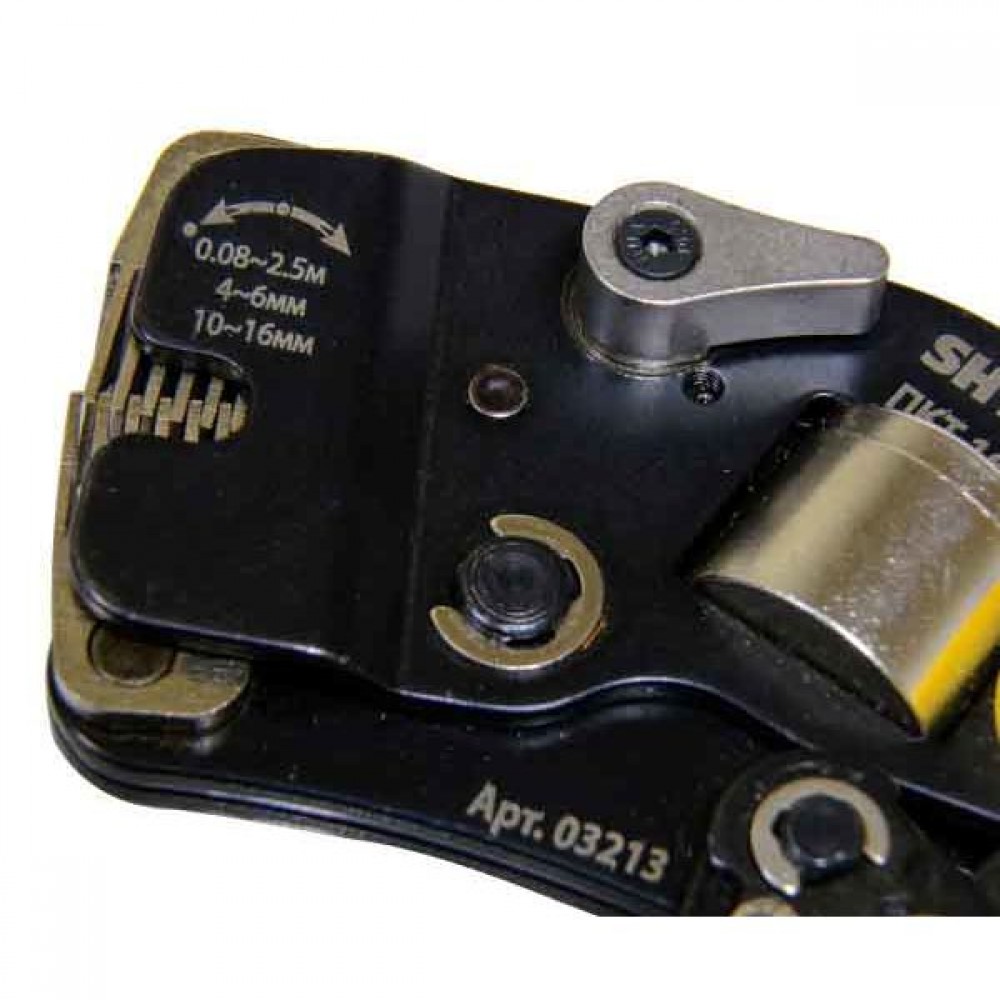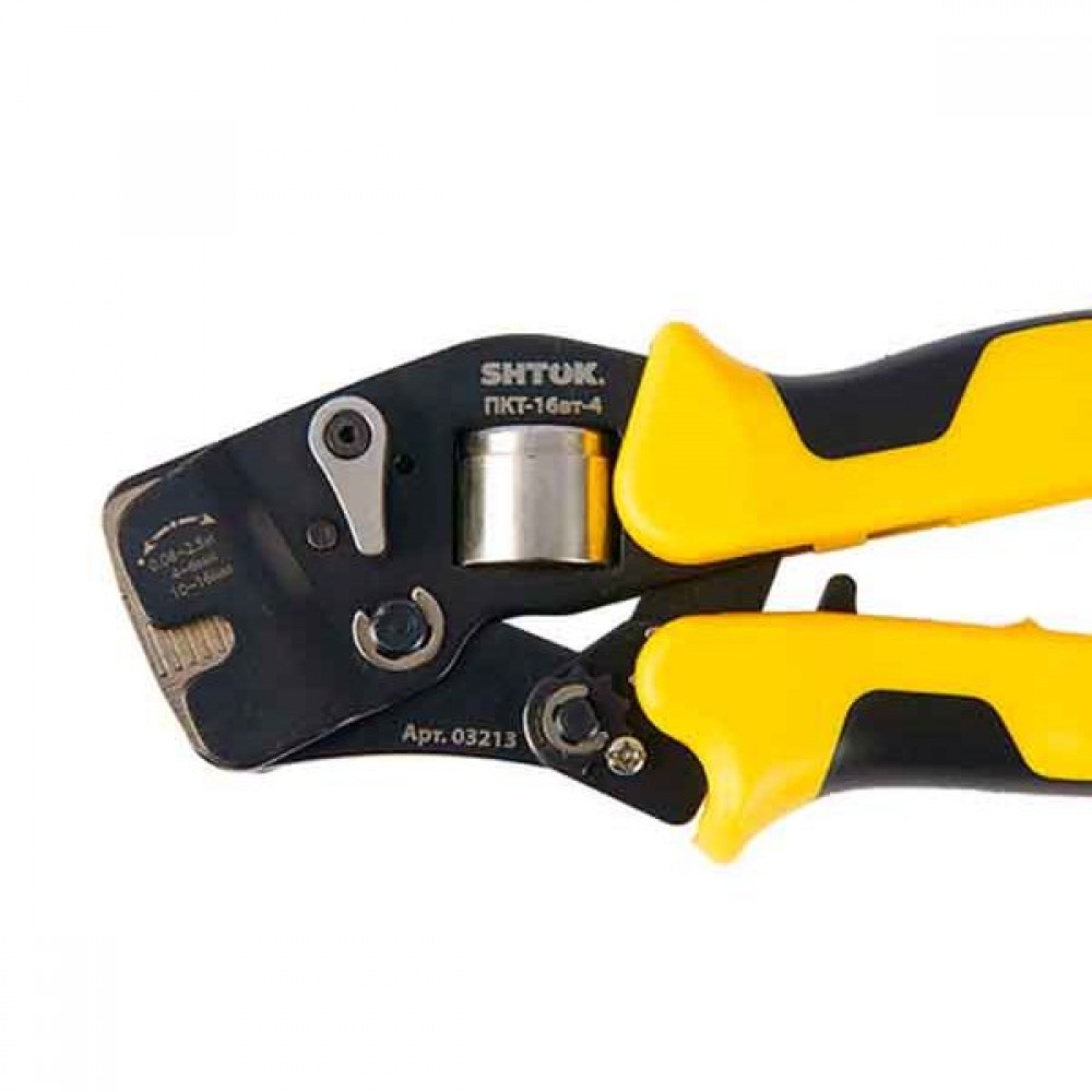 Торцевые пресс-клещи для опрессовки втулочных наконечников 0.08-16 мм2 SHTOK ПКТ-16вт-4 03213 оснащаются храповым механизмом, который автоматически разблокируется по завершении цикла. Модель изготавливается из холоднокатанной стали, что гарантирует высокую прочность и долговечность. Благодаря плотному смыканию матриц соединение отличается превосходным качеством. Конструкция изделия позволяет с комфортом работать даже в местах с ограниченным доступом.