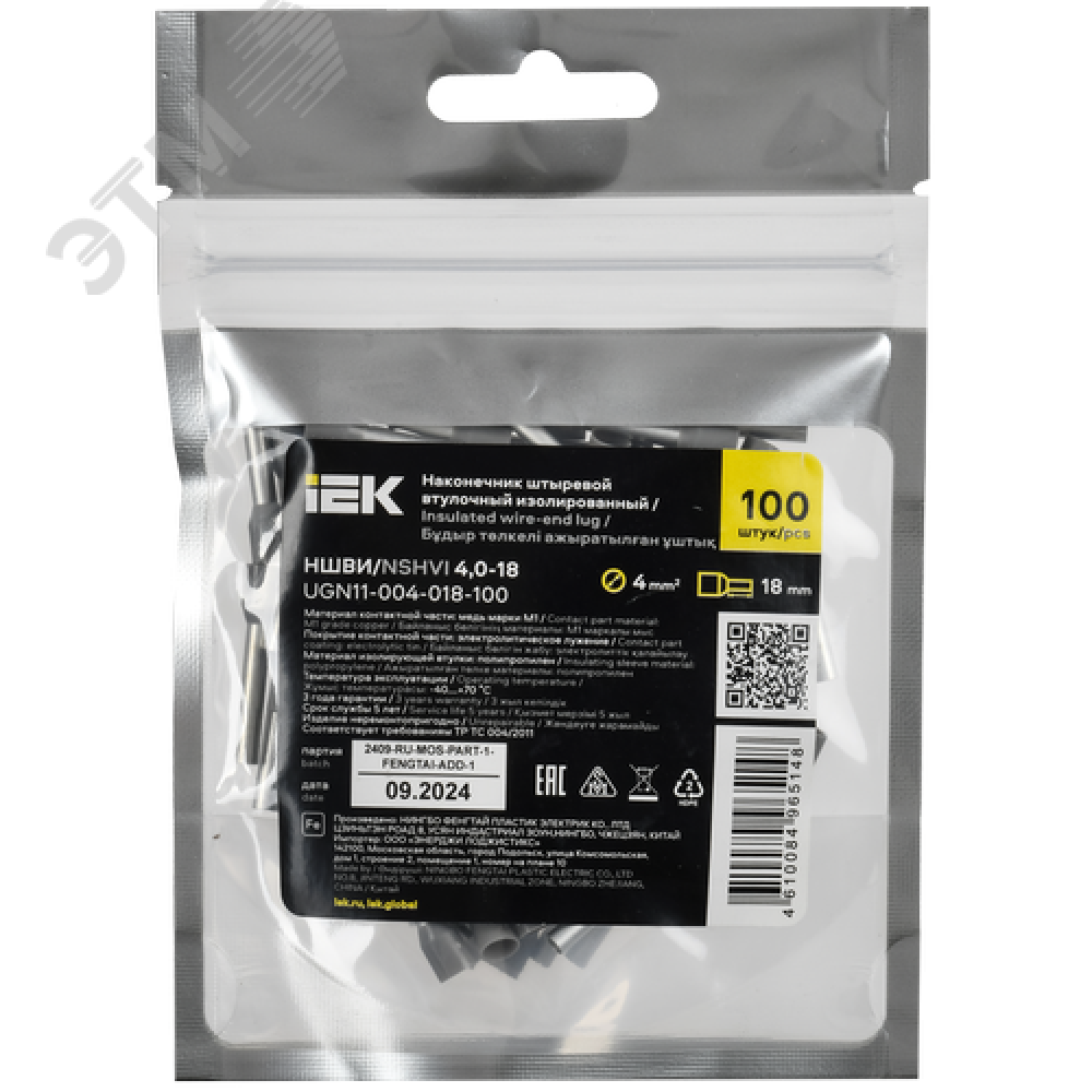 Технические характеристики Наконечник НШВИ 4,0-18 серый (100шт/упак) IEK