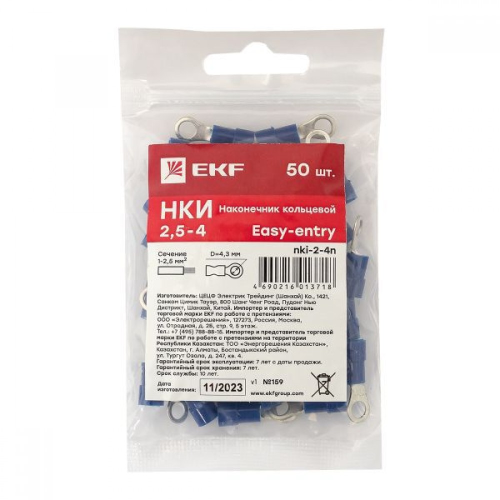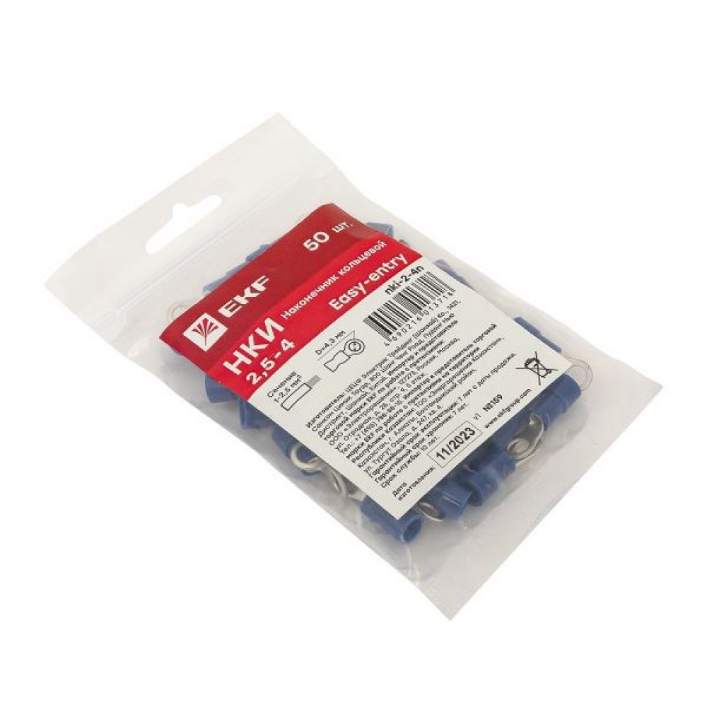 Технические характеристики Наконечник кольцевой изол. НКИ 2.5-4 (уп.50шт) EKF nki-2-4n