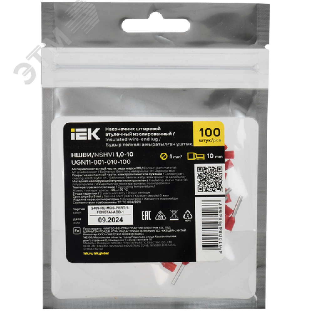 Технические характеристики Наконечник НШВИ 1,0-10 темно-красный (100шт/упак) IEK