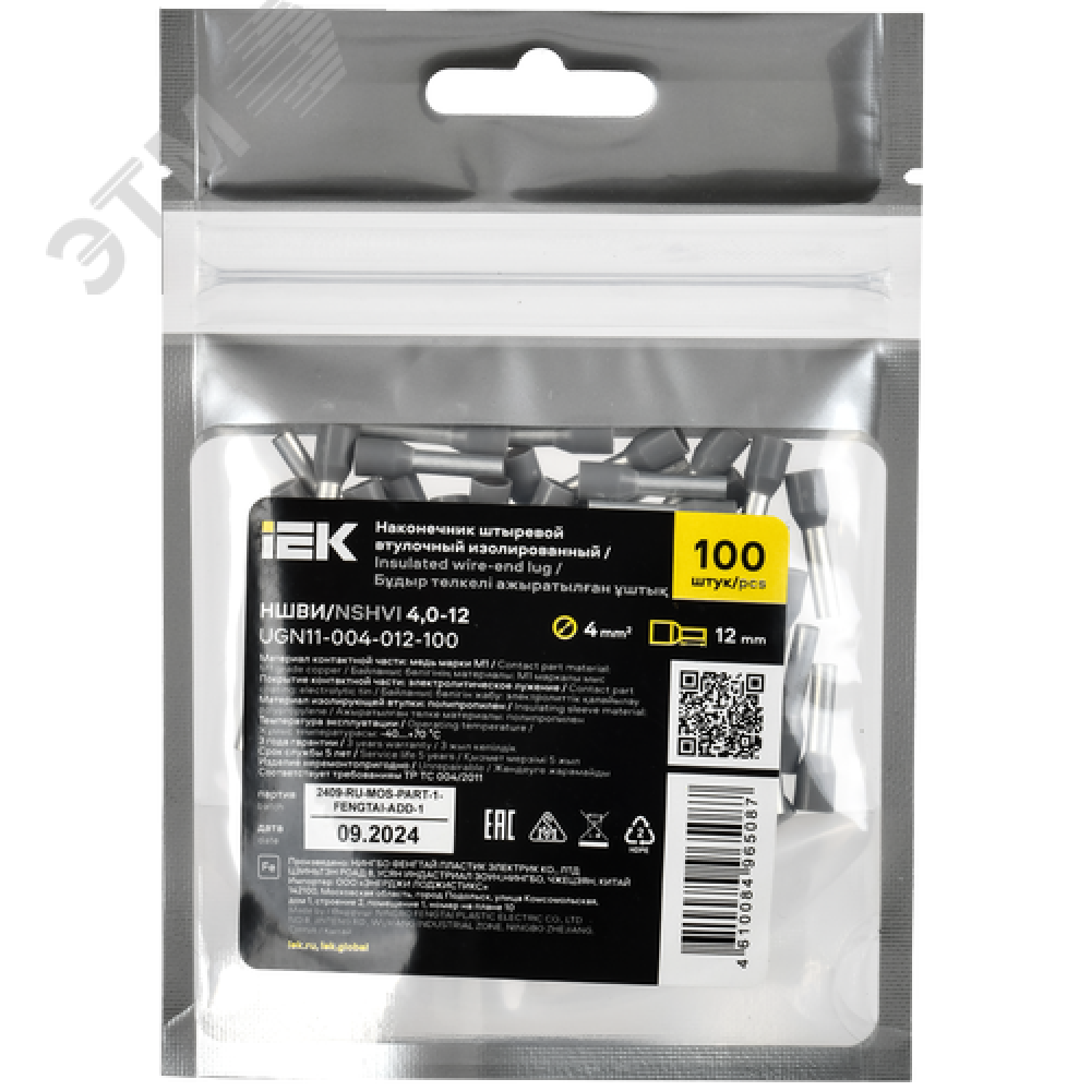 Технические характеристики Наконечник НШВИ 4,0-12 серый (100шт/упак) IEK