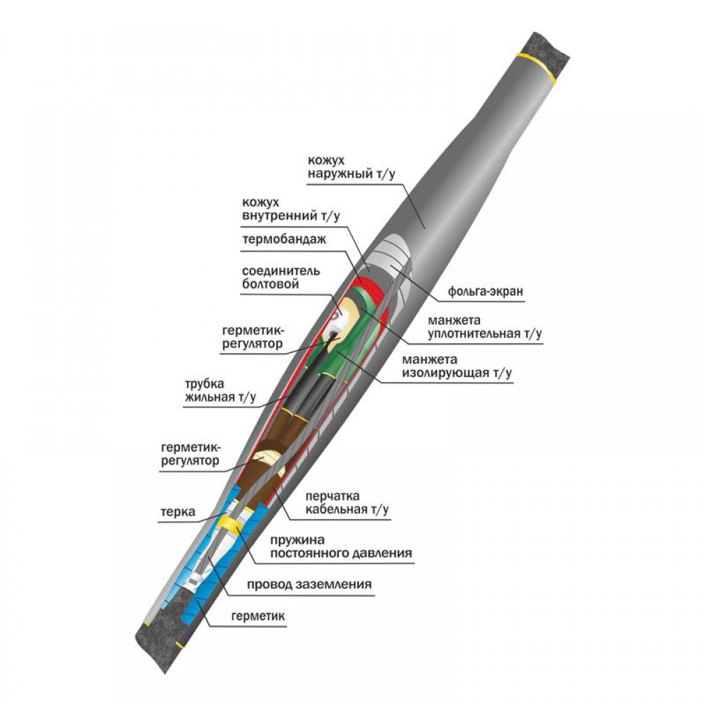 Монтируется на двух концах соединяемых кабелей методом термоусаживания основных деталей из модифицированного полимера, входящих в комплект муфты, с помощью горелки или высокотемпературного фена.