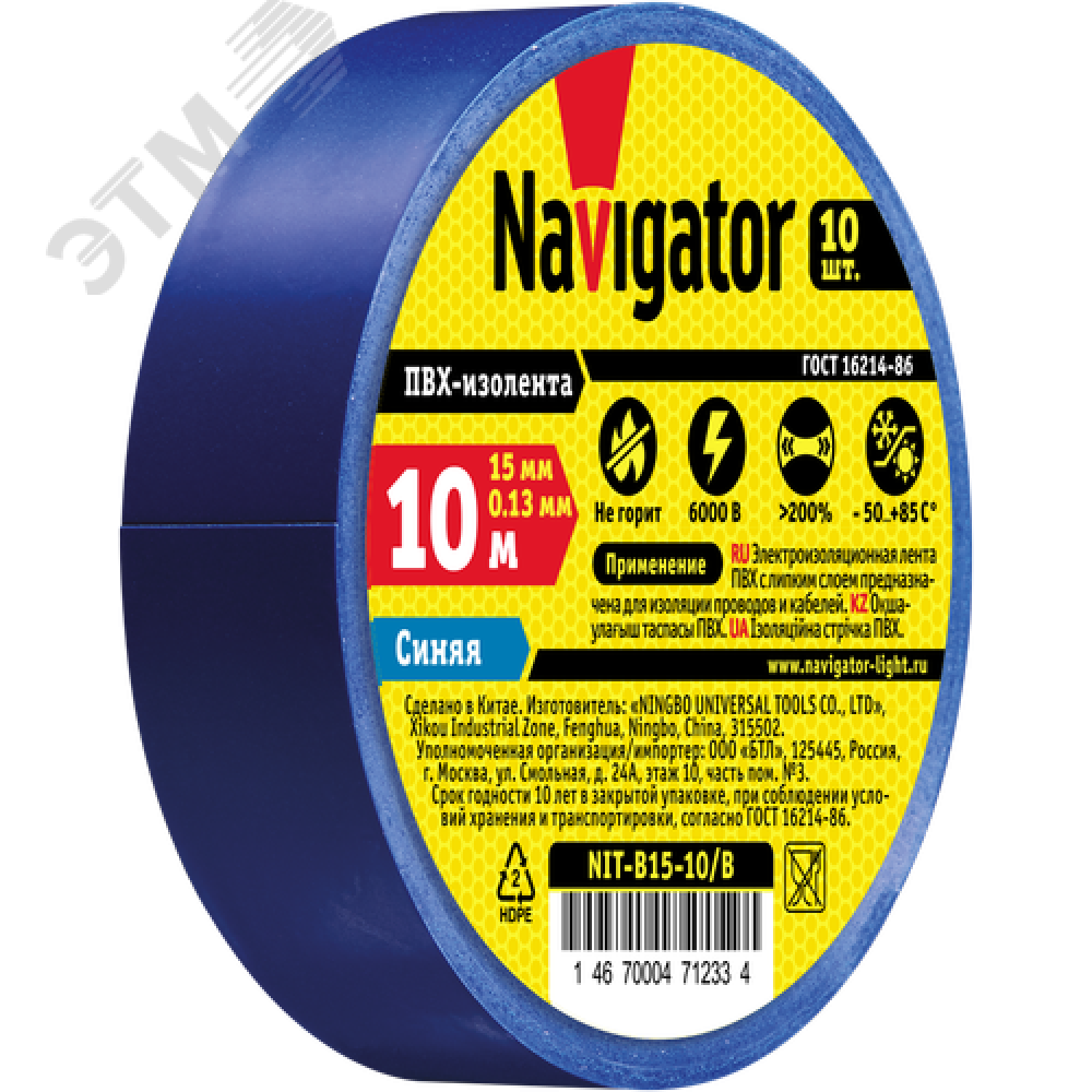 Технические характеристики Изолента ПВХ синяя 15мм 10м NIT-B15-10/B