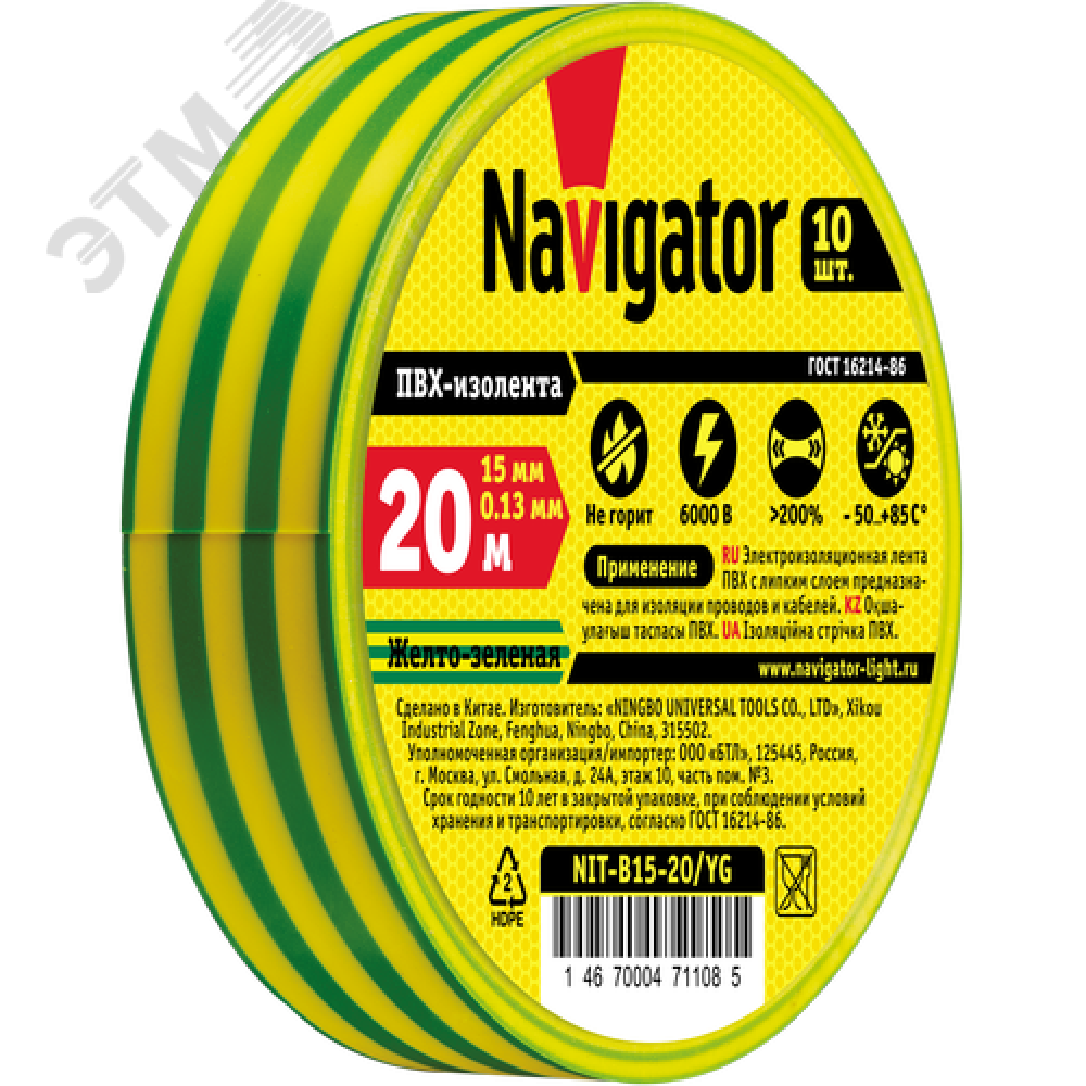 Технические характеристики Изолента ПВХ желто-зеленая 15мм 20м