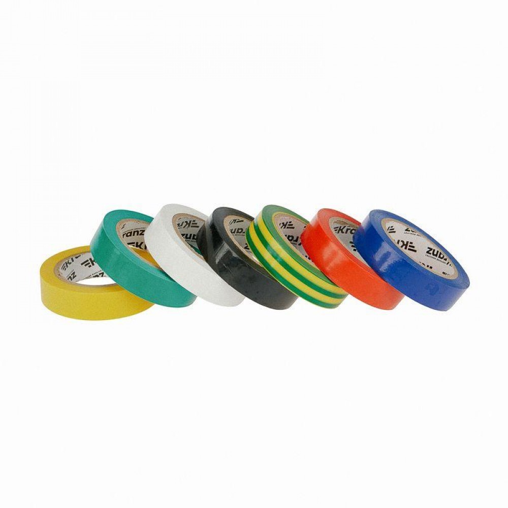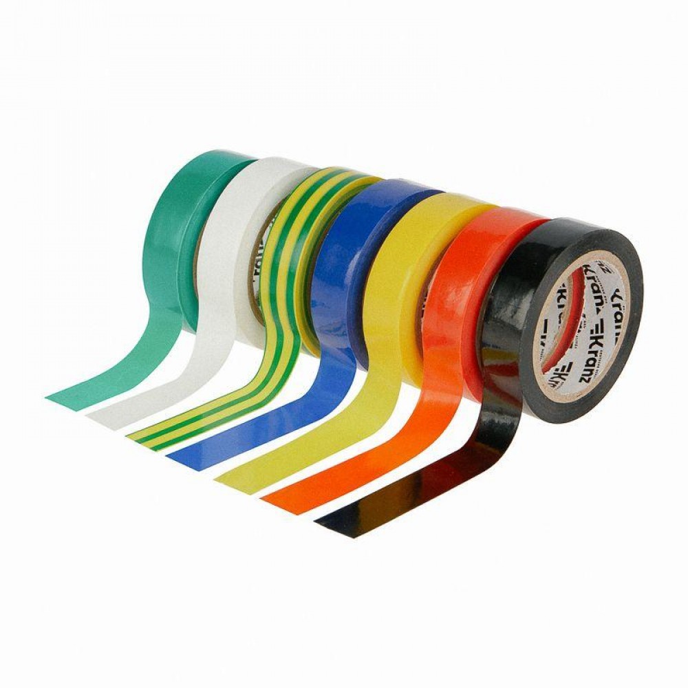 В наборе семь ПВХ-изолент разных цветов, принятых в электротехнике: черного, белого, синего, красного, зеленого, желтого и зелено-желтого.