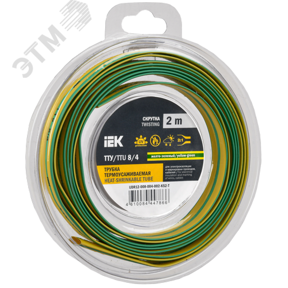 Технические характеристики Трубка термоусадочная ТТУ нг-LS 8/4 желто-зеленая (2м/упак) IEK
