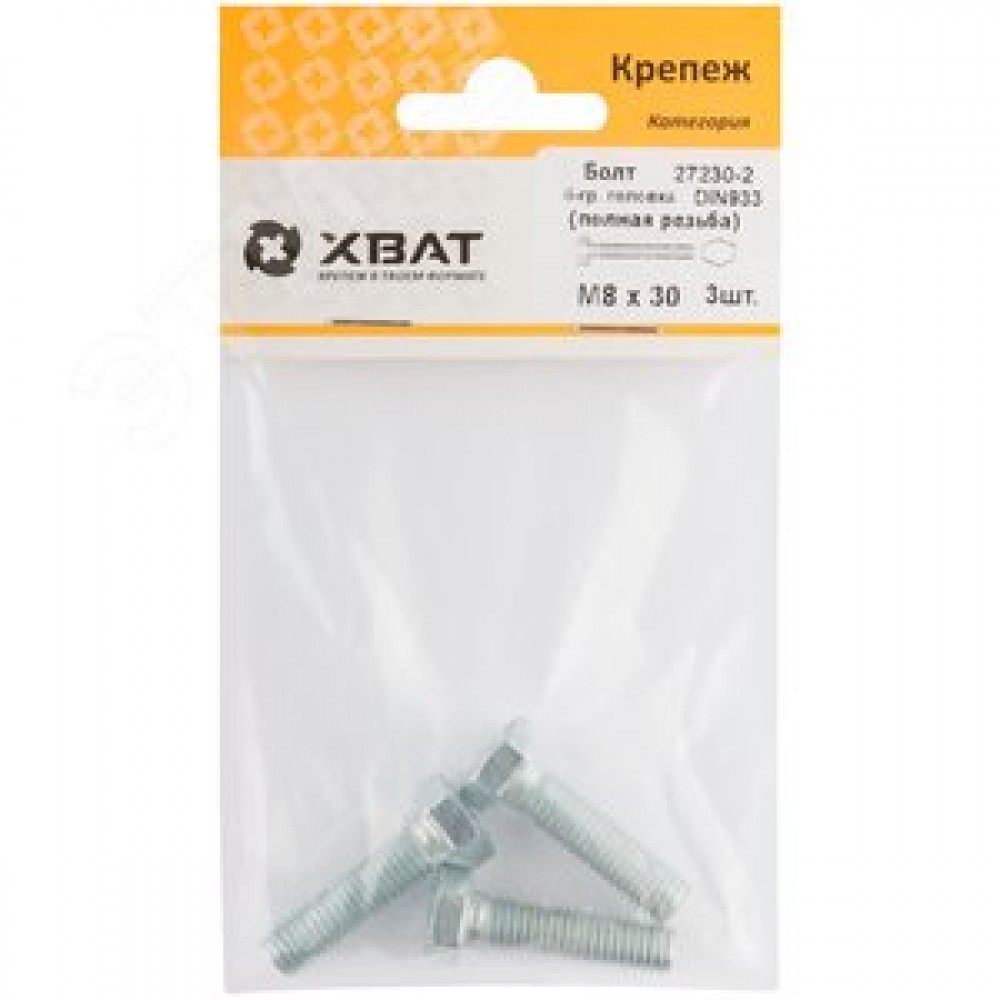 Технические характеристики Болт DIN933 М8х30 шестигранная голова полная резьба оцинкованный (3 шт)