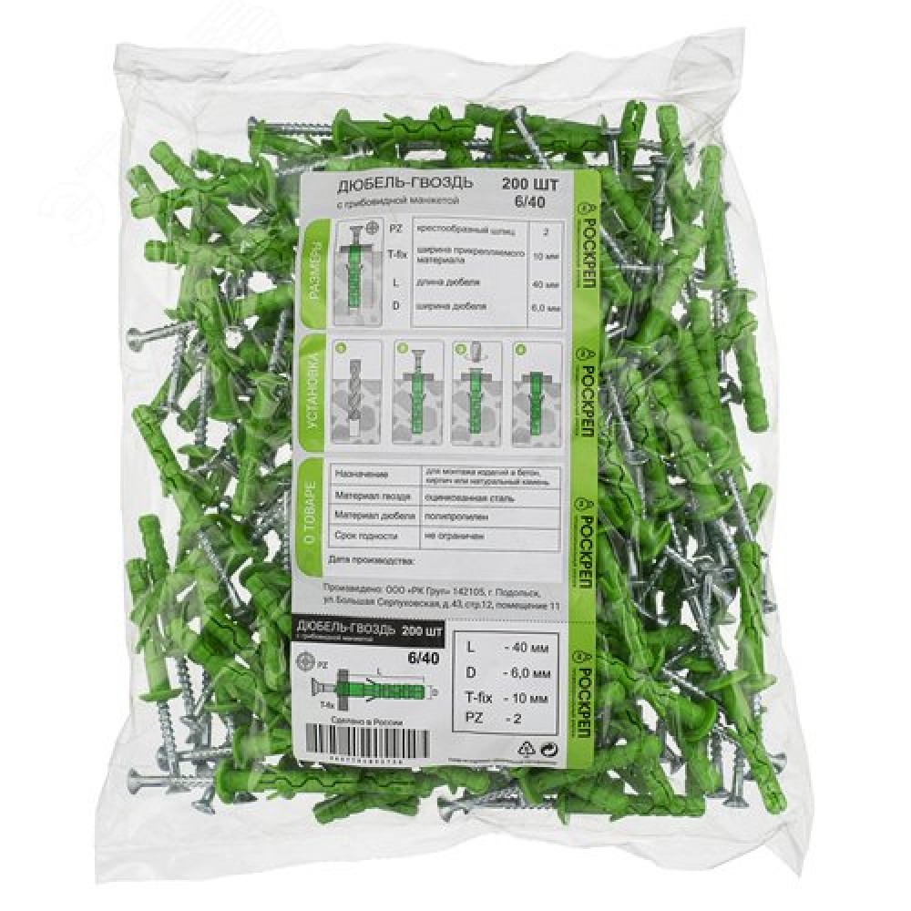 • Дюбель-гвоздь 6х40 грибовидная манжета (200 шт)