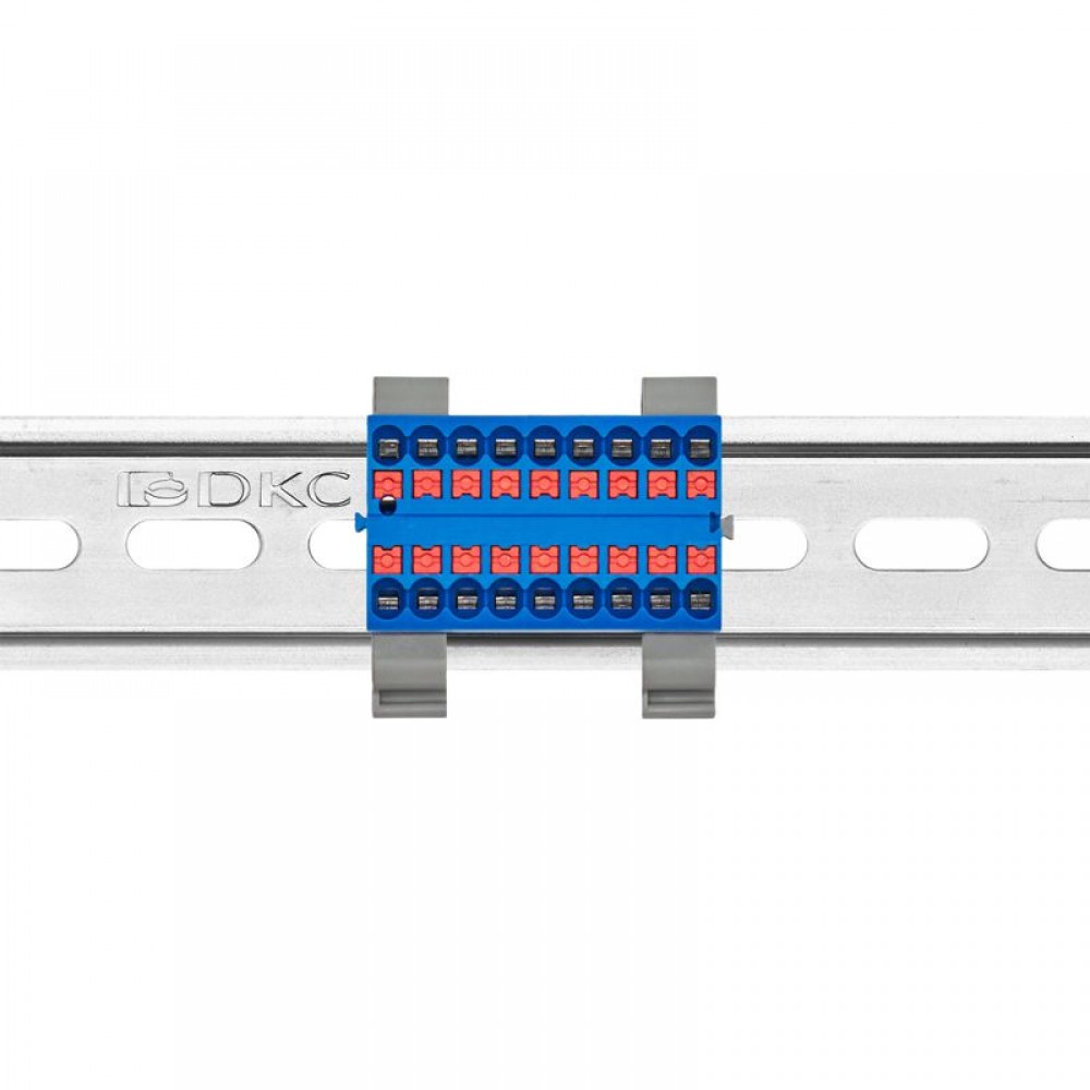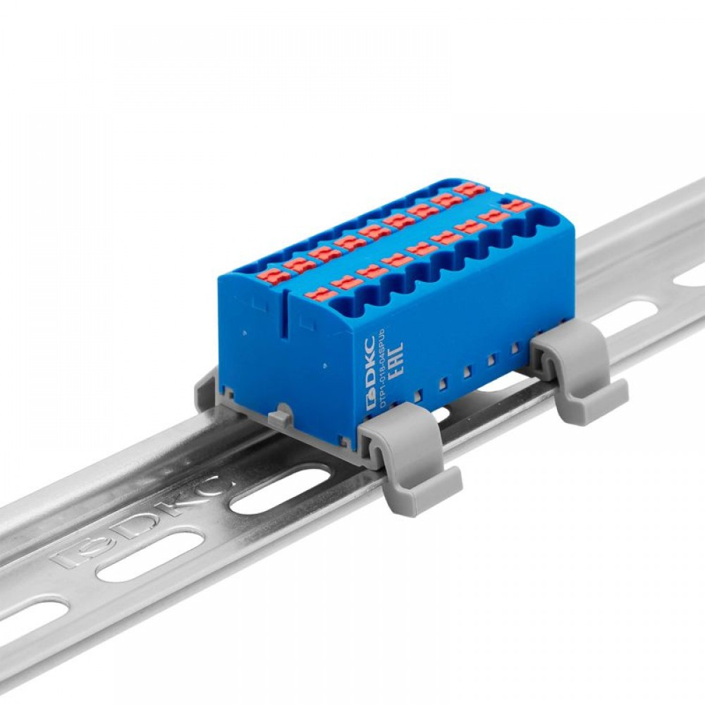 Блок распределительный с горизонт. адаптером на рейку шир. 35мм зажим push-in 18 точек подключения 2.5кв.мм син. DKC DTP1-018-04SPUB-H