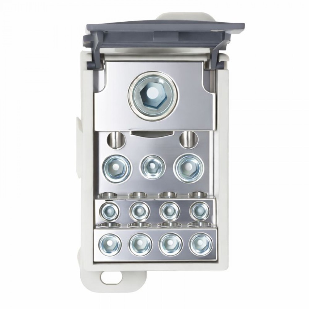 Распределительный блок POD-250 с винтовым зажимом служит для соединения и распределения многожильных или обжатых наконечником гибких проводников в электрических щитах. Установка на DIN-рейку высотой 35 мм или монтажную плату. Боковой штифт обеспечивает стыковку блоков между собой. На крышке распределительного блока нанесена ключевая информация, а также есть паз для маркировки NUTB5. В комплект входит цветная пластиковая маркировка (синий, зеленый, красный, желтый) и самоклеящаяся (L1, L2, L3, N, заземление, круг). Корпус выполнен из полиамида с классом горючести V0 UL-94. Степень защиты – IP20. Цвет – серый, 1 ввод сечением 95-185 мм2, 11 точек подключения (выводов) с номинальным сечением проводников 2,5-35 мм2. Габариты (В?Ш?Г) – 51,5?49?96,5 мм.