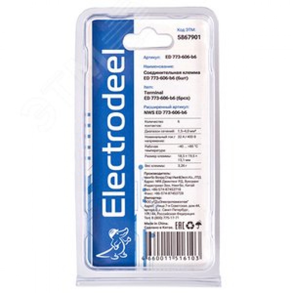 Технические характеристики Клемма соединительная 6-контактная Elеctrodeel ED 773-606-b6, сечение 1,5-4,0 мм2, 32А/400В (упаковка 6 штук)