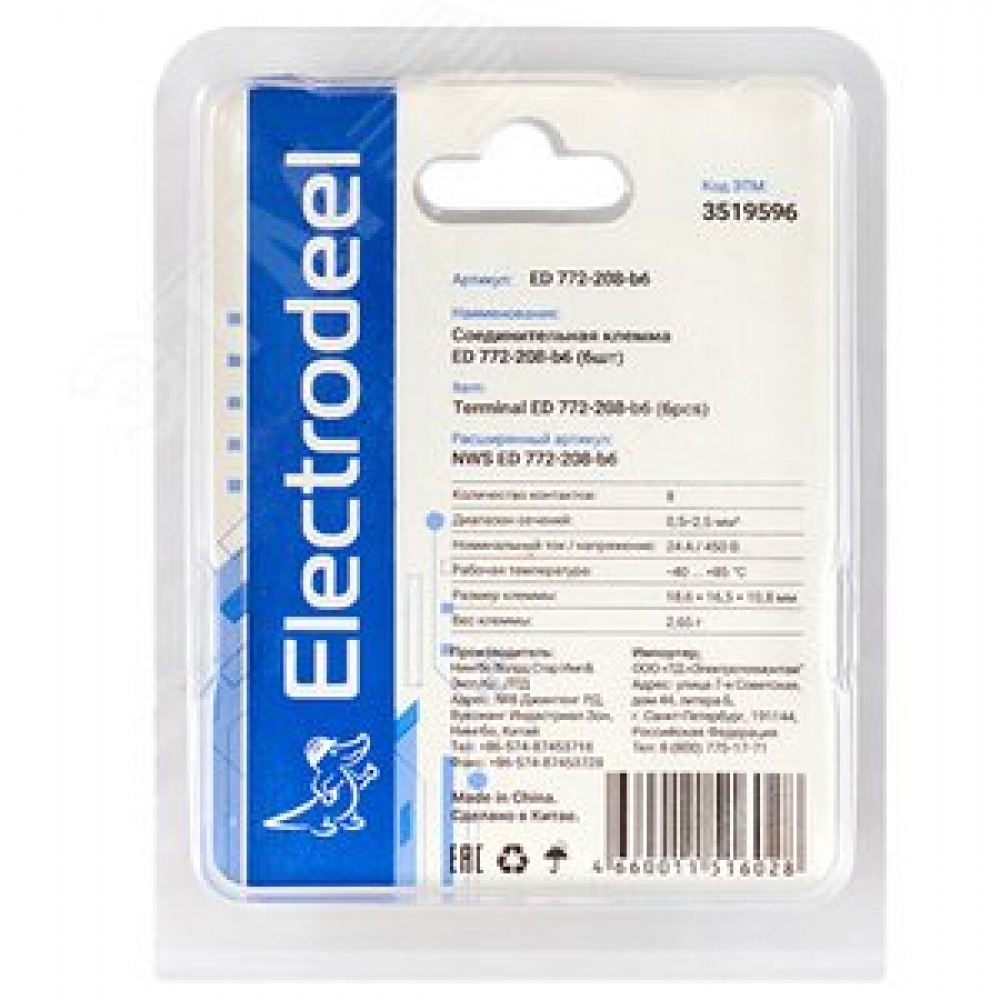 Технические характеристики Клемма соединительная 8-контактная Elеctrodeel ED 772-208-b6, сечение 0,5-2,5 мм2, 24А/450В (упаковка 6 штук)