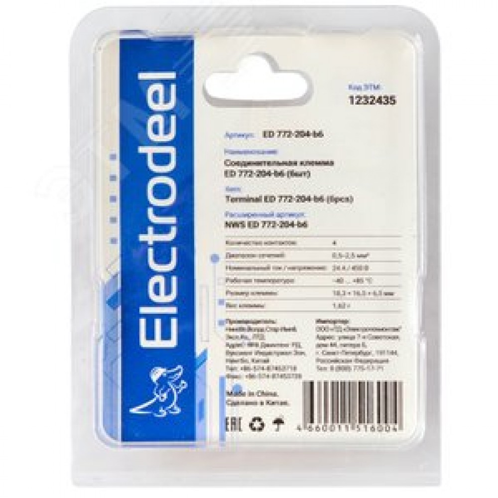 Технические характеристики Клемма соединительная 4-контактная Elеctrodeel ED 772-204-b6, сечение 0,5-2,5 мм2, 24А/450В (упаковка 6 штук)