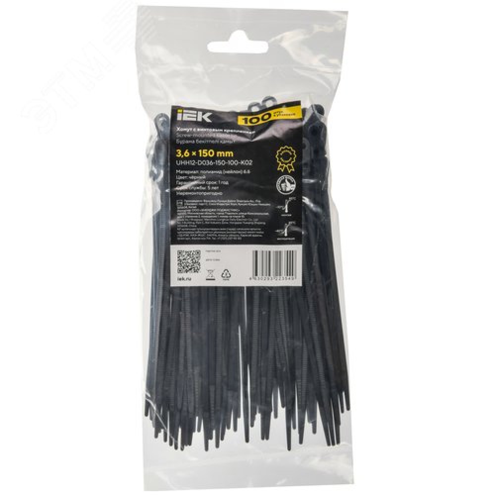 Технические характеристики Хомут P6.6 с винтовым креплением черный 3.6х150мм 100шт/упак IEK